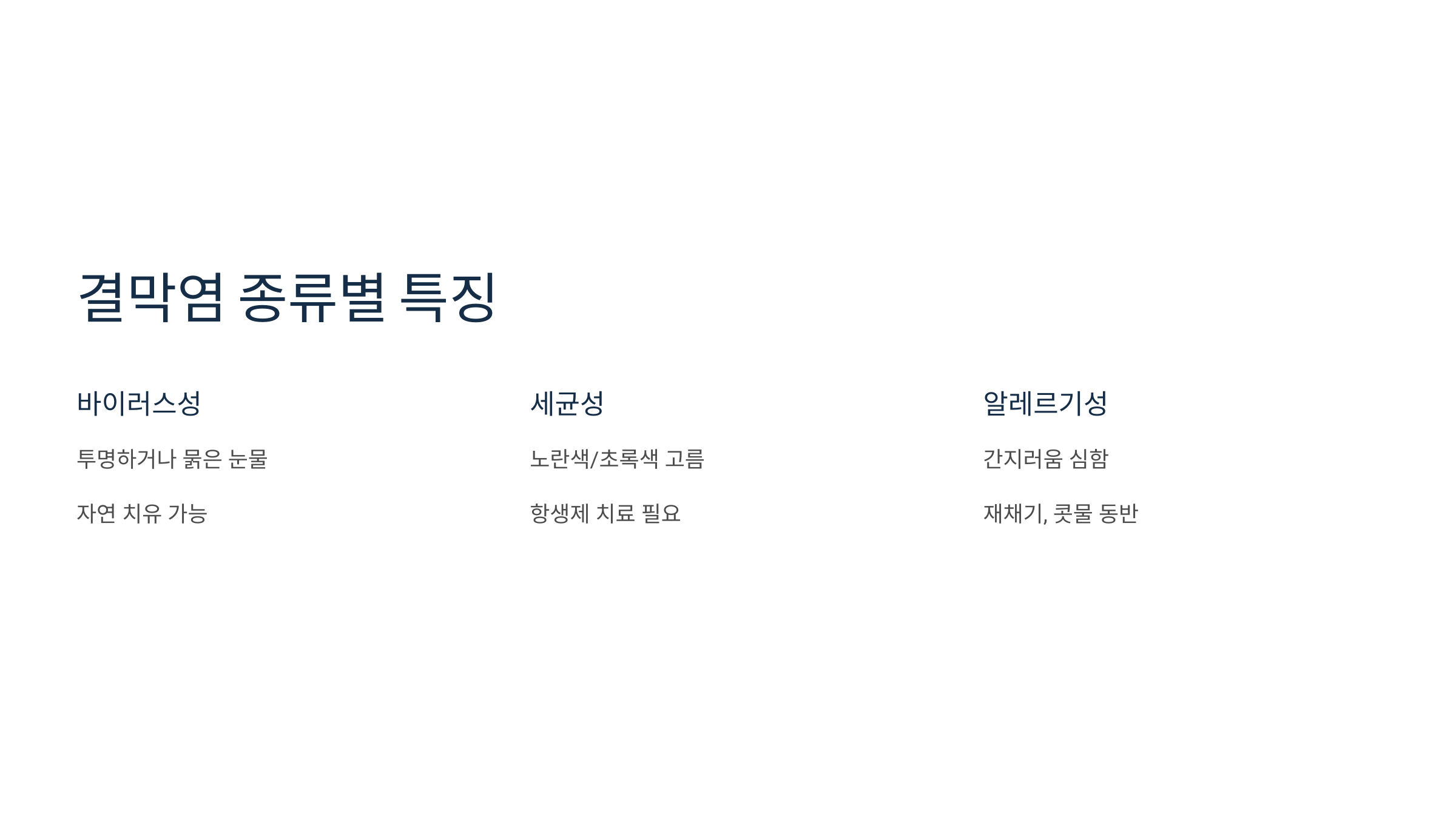 바이러스성, 세균성, 알레르기성 각각 조금씩 다르기 때문에, 정확한 진단이 중요합니다.