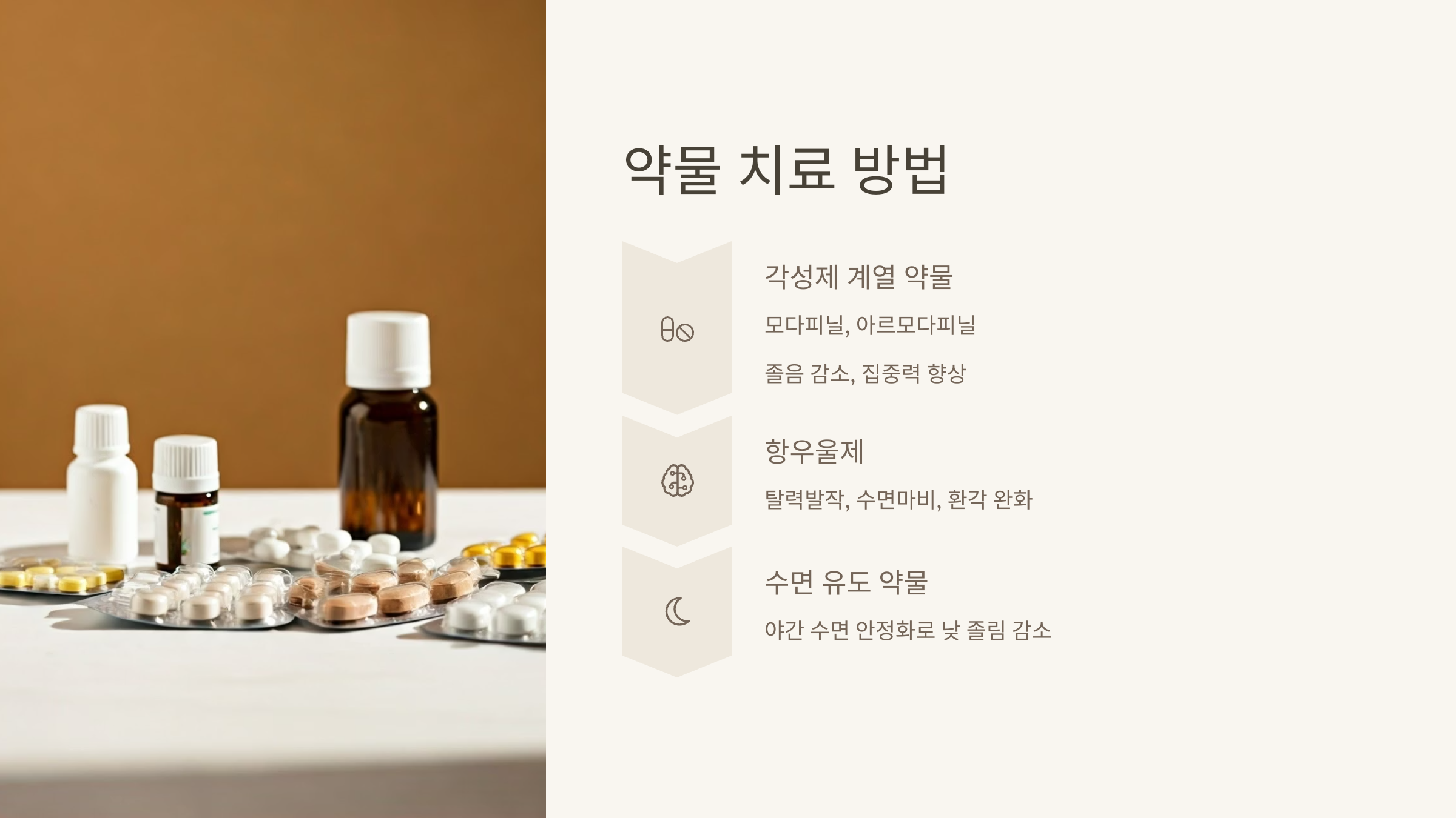 - 각성제 계열 약물: 졸음을 줄이고 집중력을 높이는 데 사용돼요. (예: 모다피닐, 아르모다피닐)