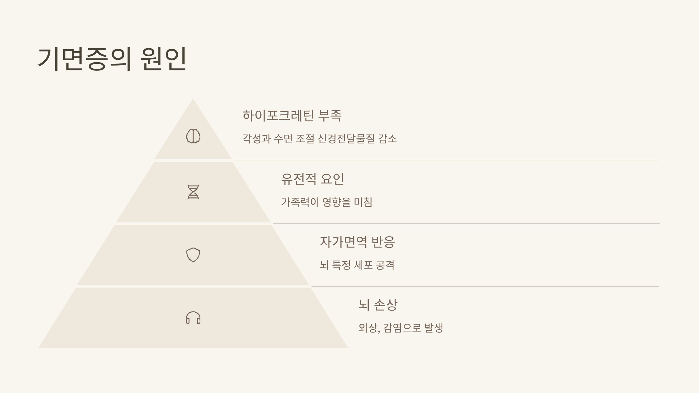 - 자가면역 반응 - 뇌의 특정 세포를 공격하면서 하이포크레틴이 감소해요.