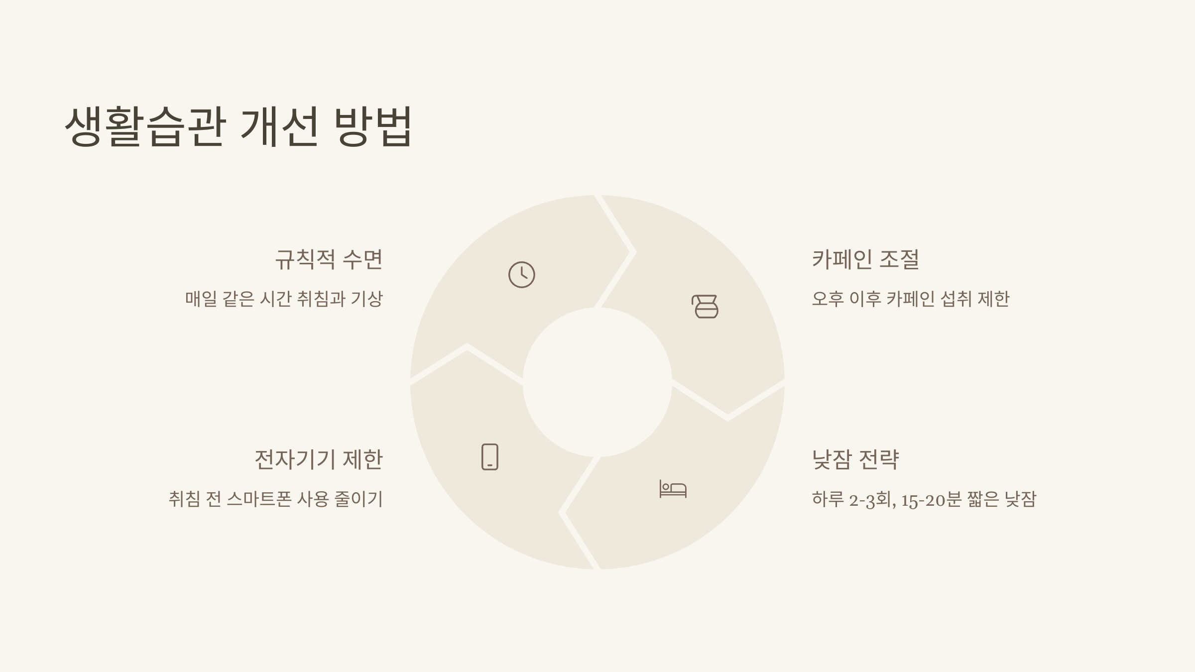 - 카페인 섭취 조절 - 오후 이후 카페인 음료 피하기