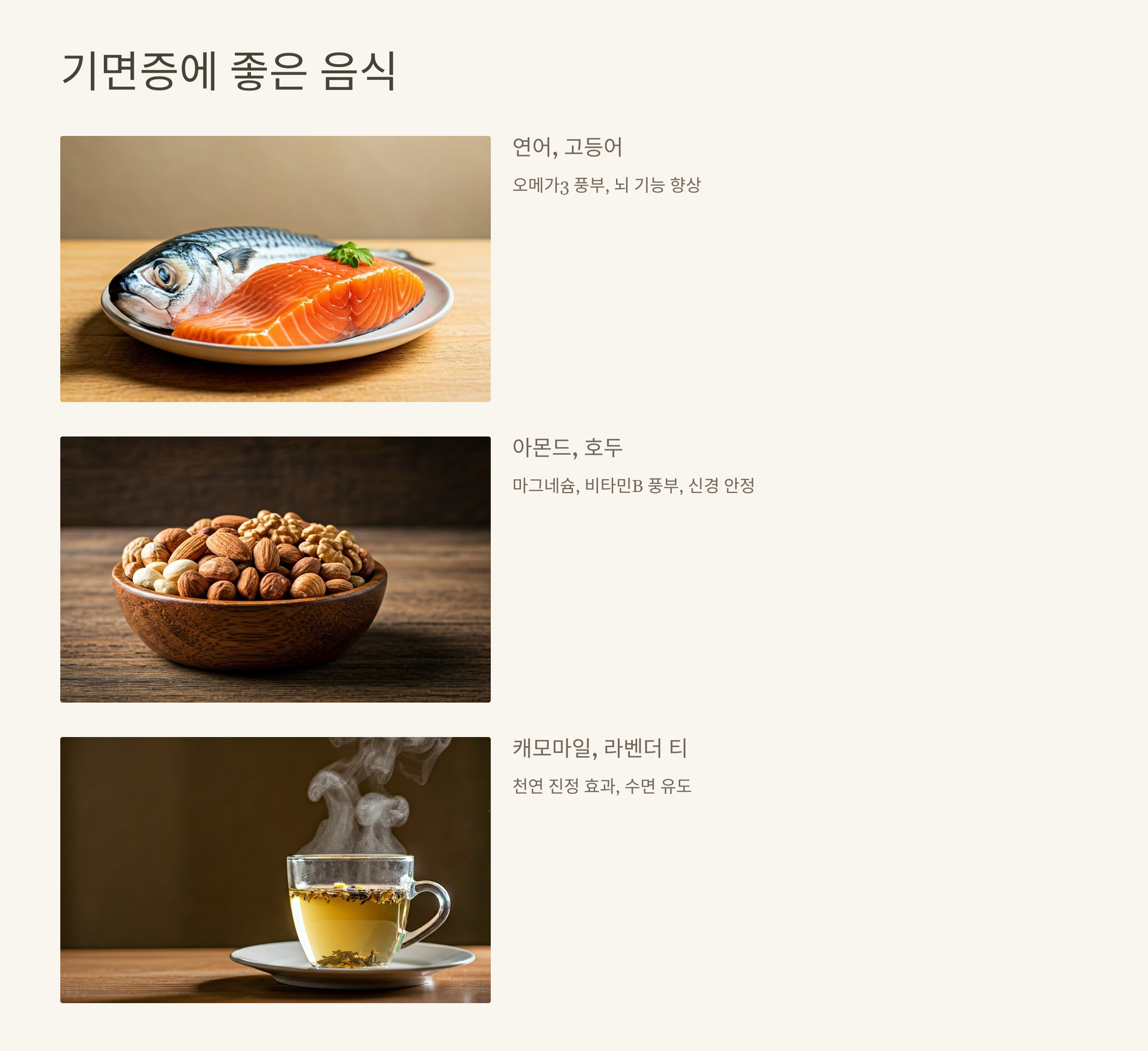 기면증에 도움을 줄 수 있는 음식들은 뇌 건강과 신경 안정에 도움이 되는 영양소 중심으로 구성되어 있어요.