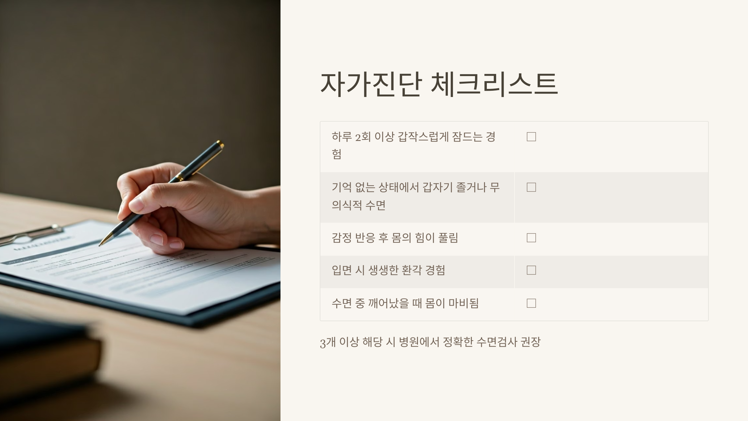 - 수면마비: 깨어 있을 때 움직일 수 없는 마비 증상이 동반되기도 해요.