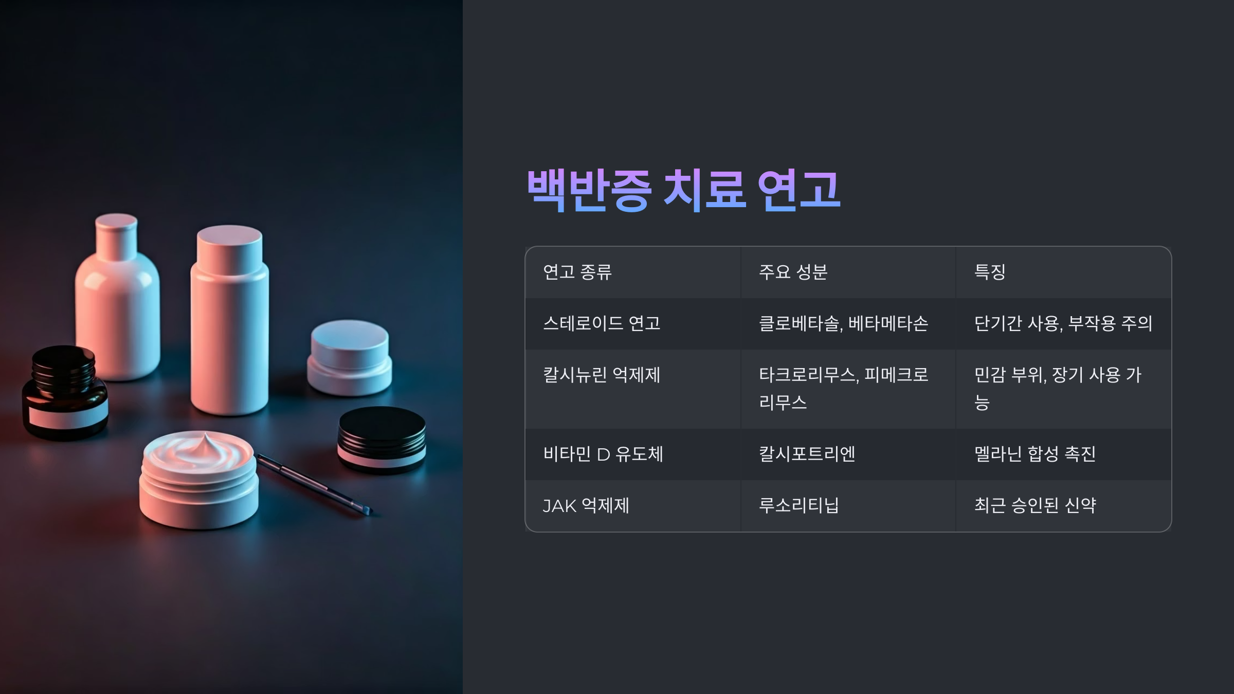 아래는 백반증 치료에 사용되는 주요 연고 종류와 특징이에요.