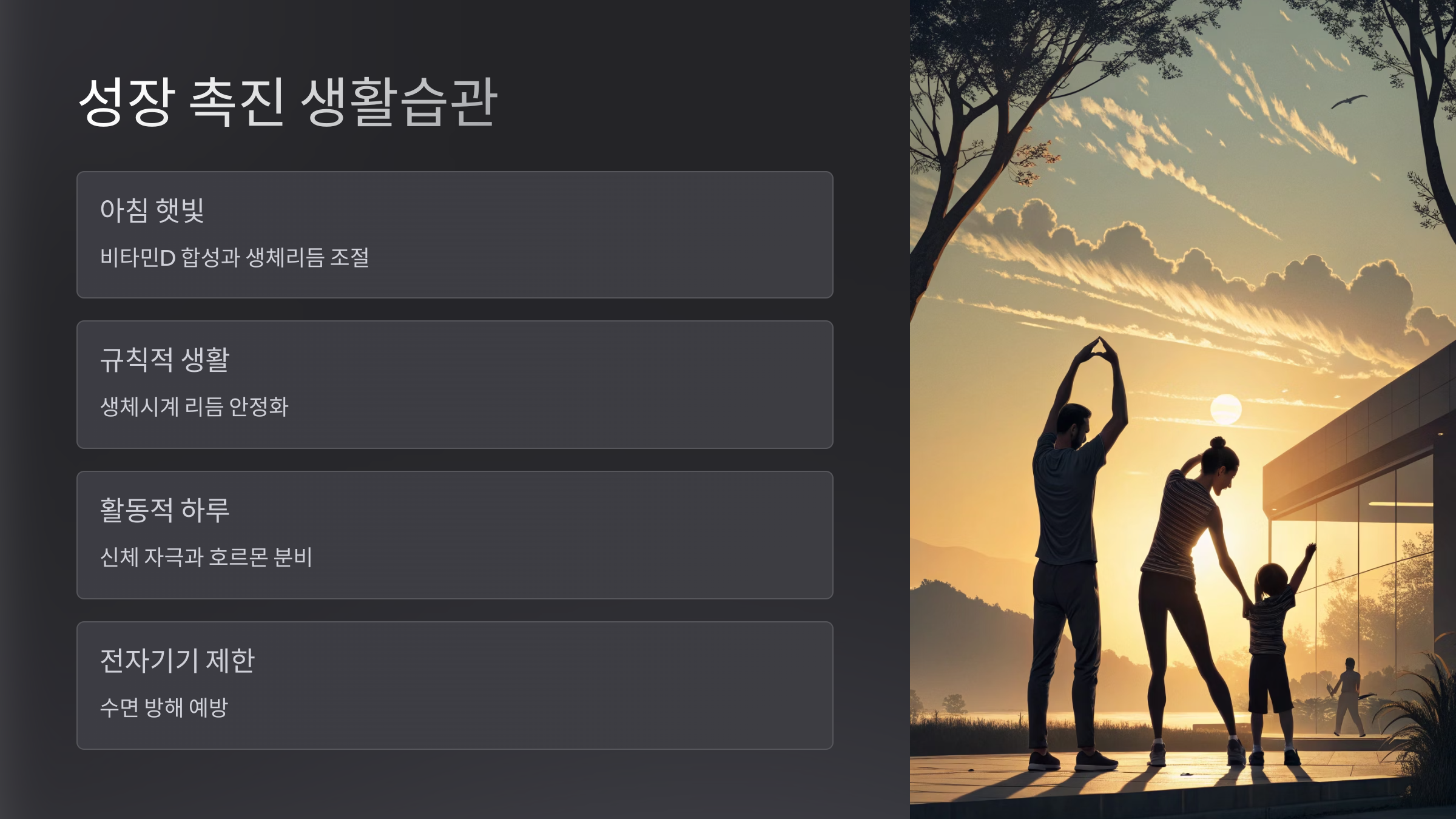 성장호르몬은 밤 10시~새벽 2시에 가장 활발히 분비되므로 10시 이전 취침이 좋아요.
