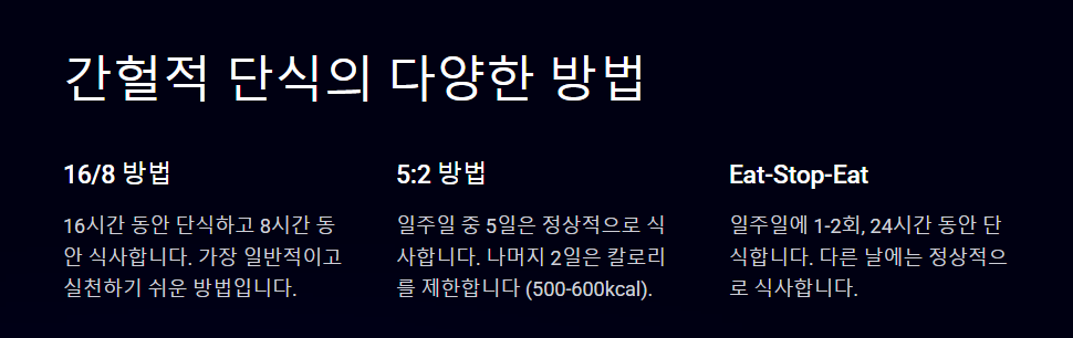 | 16:8 방식 | 하루 16시간 단식, 8시간 동안 식사 (예: 12시~8시 식사, 8시 이후 금식) |