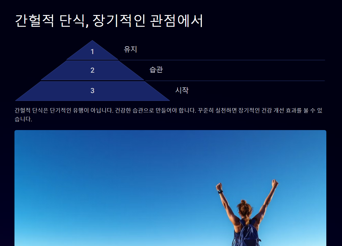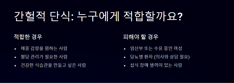 → 체질에 따라 간헐적 단식이 맞지 않을 수도 있어요. 몸의 반응을 잘 살피며 진행하는 것이 중요합니다.