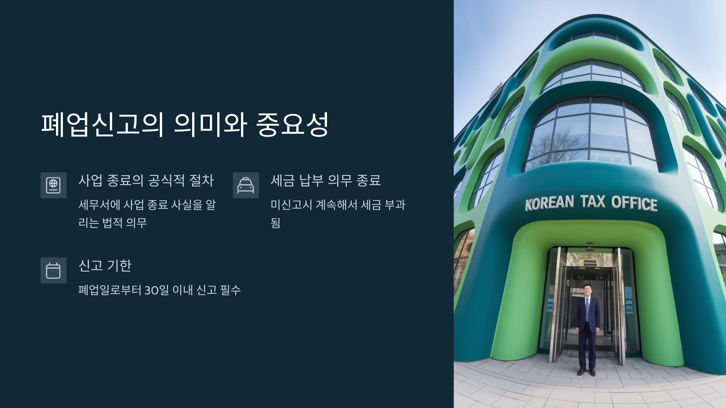 폐업신고는 단순한 서류 제출이 아니라, 세무 종료와 관련된 모든 절차를 포함한 중요한 단계입니다.