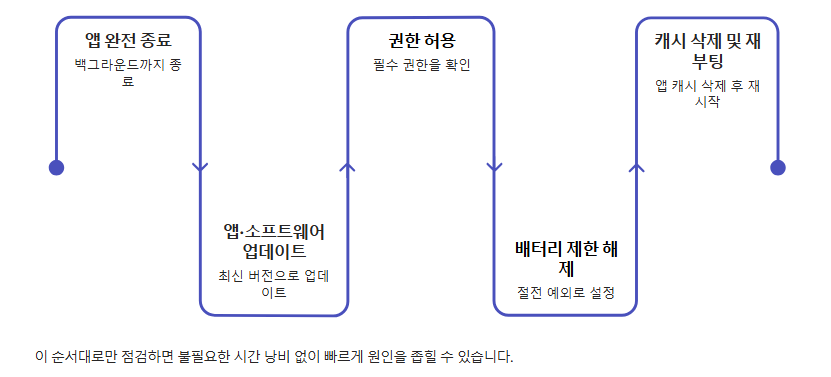 | 이용 방법 | 앱 재실행 → 업데이트 확인 → 권한 허용 → 배터리 제한 해제 → 캐시 삭제 순서로 점검합니다. |