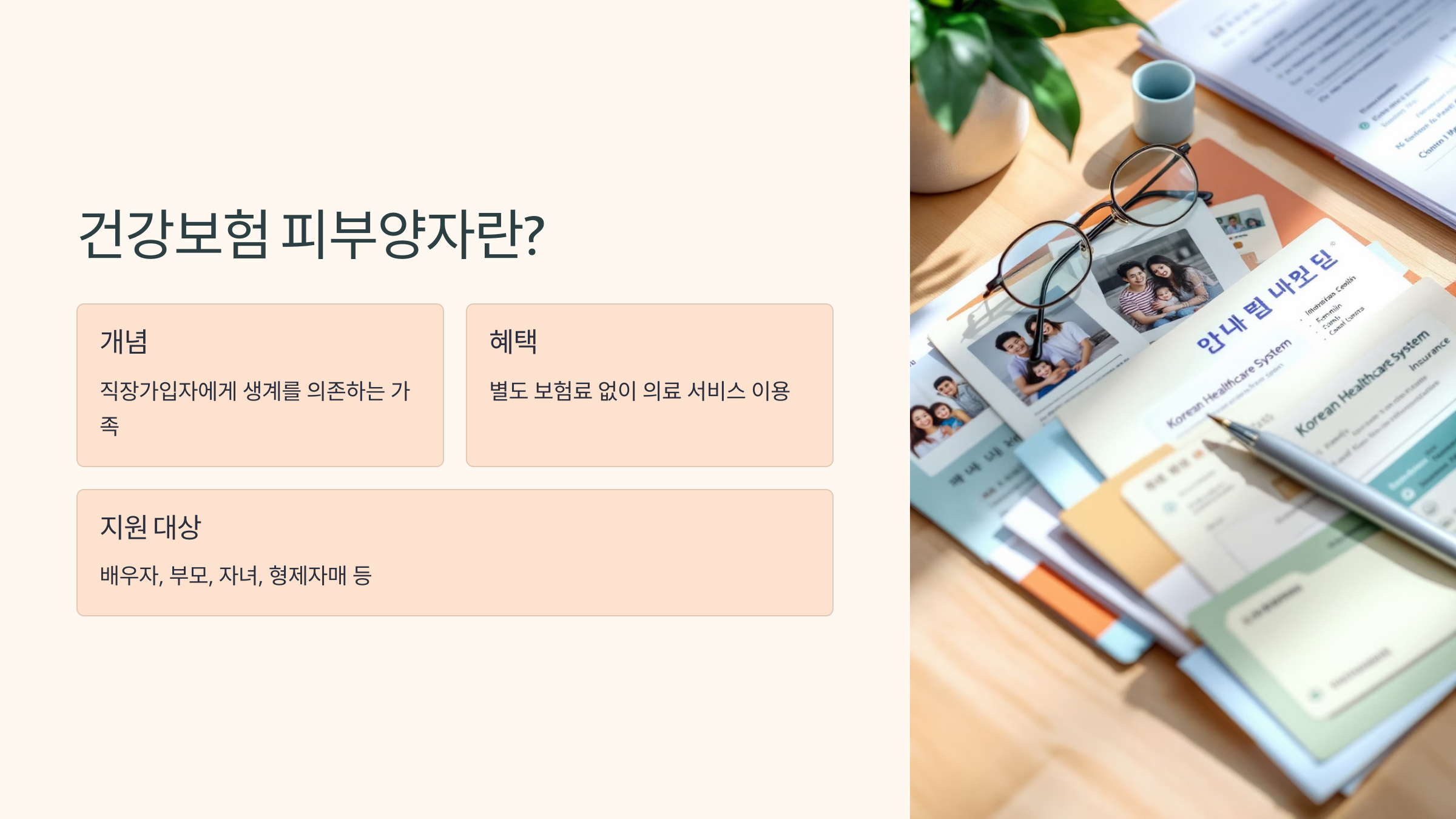 건강보험 피부양자는 직장가입자에게 생계를 의존하는 가족 구성원 중 일정 기준을 충족할 경우, 별도의 보험료 없이 건강보험 혜택을 함께 받을 수 있는 제도입니다.