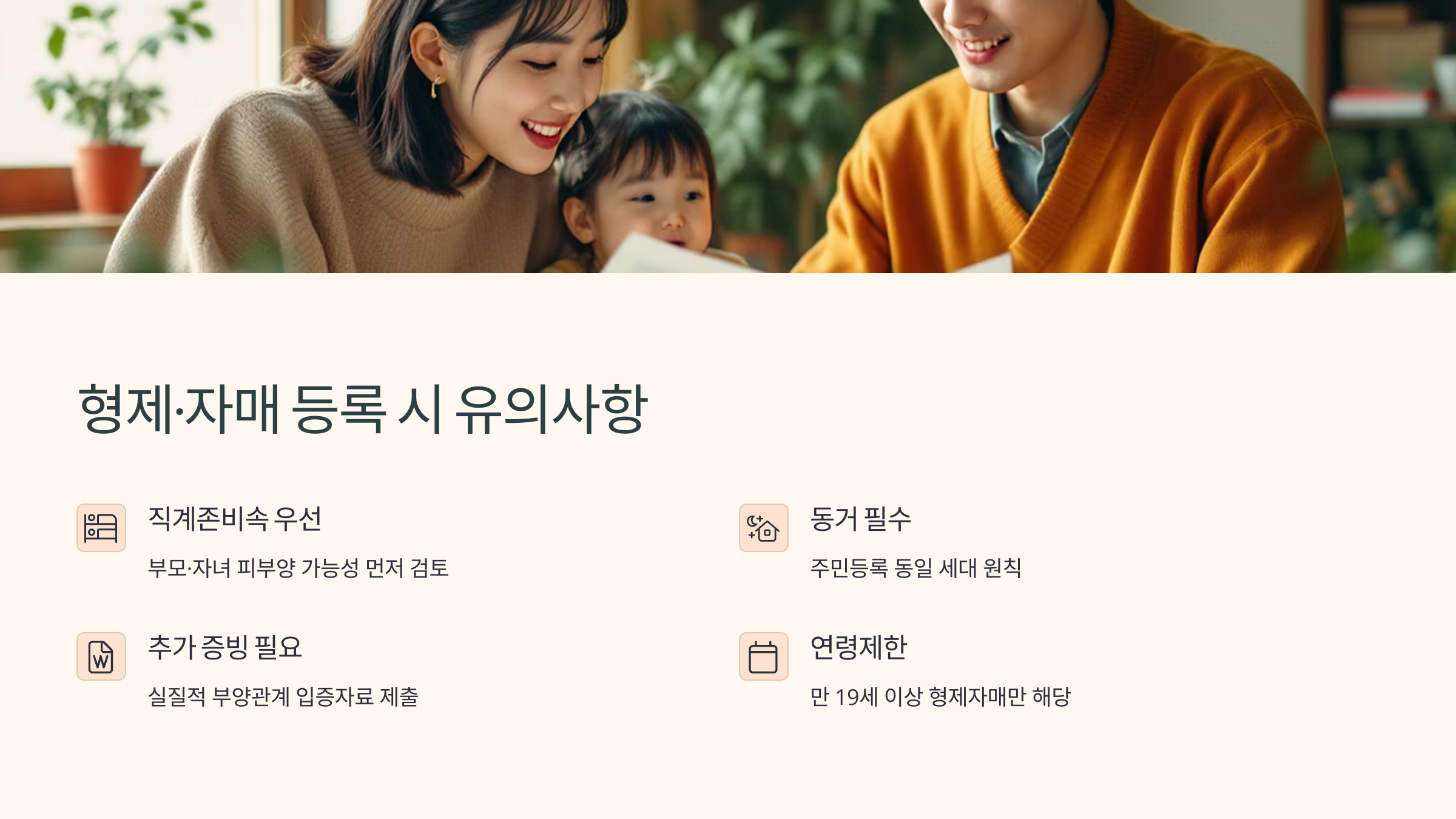 특히 형제·자매는 일반적인 경우와 달리 조건이 까다로운 편이에요. 예를 들어, 미혼이며 30세 미만 또는 65세 이상이거나, 장애인, 국가유공자, 보훈대상자 상이자 등의 조건을 만족해야 등록이 가능합니다.