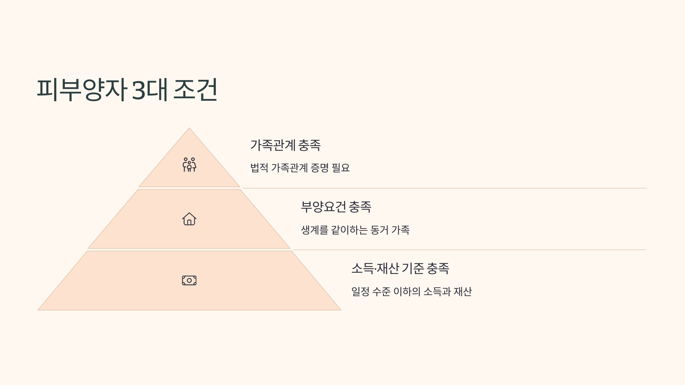 건강보험 피부양자가 되기 위해서는 ‘3가지 조건’을 모두 만족해야 합니다. 하나라도 충족하지 못하면 피부양자 등록이 불가능하며, 지역가입자로 전환되어 별도의 보험료를 납부해야 해요.