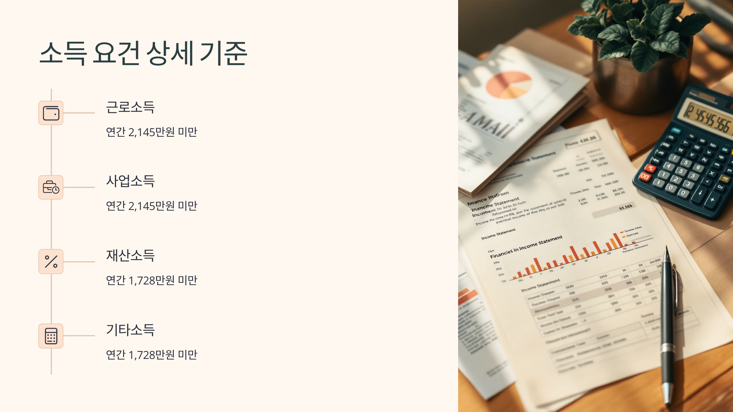 | 소득 요건 | 연간 합산 소득 2,000만 원 이하 |