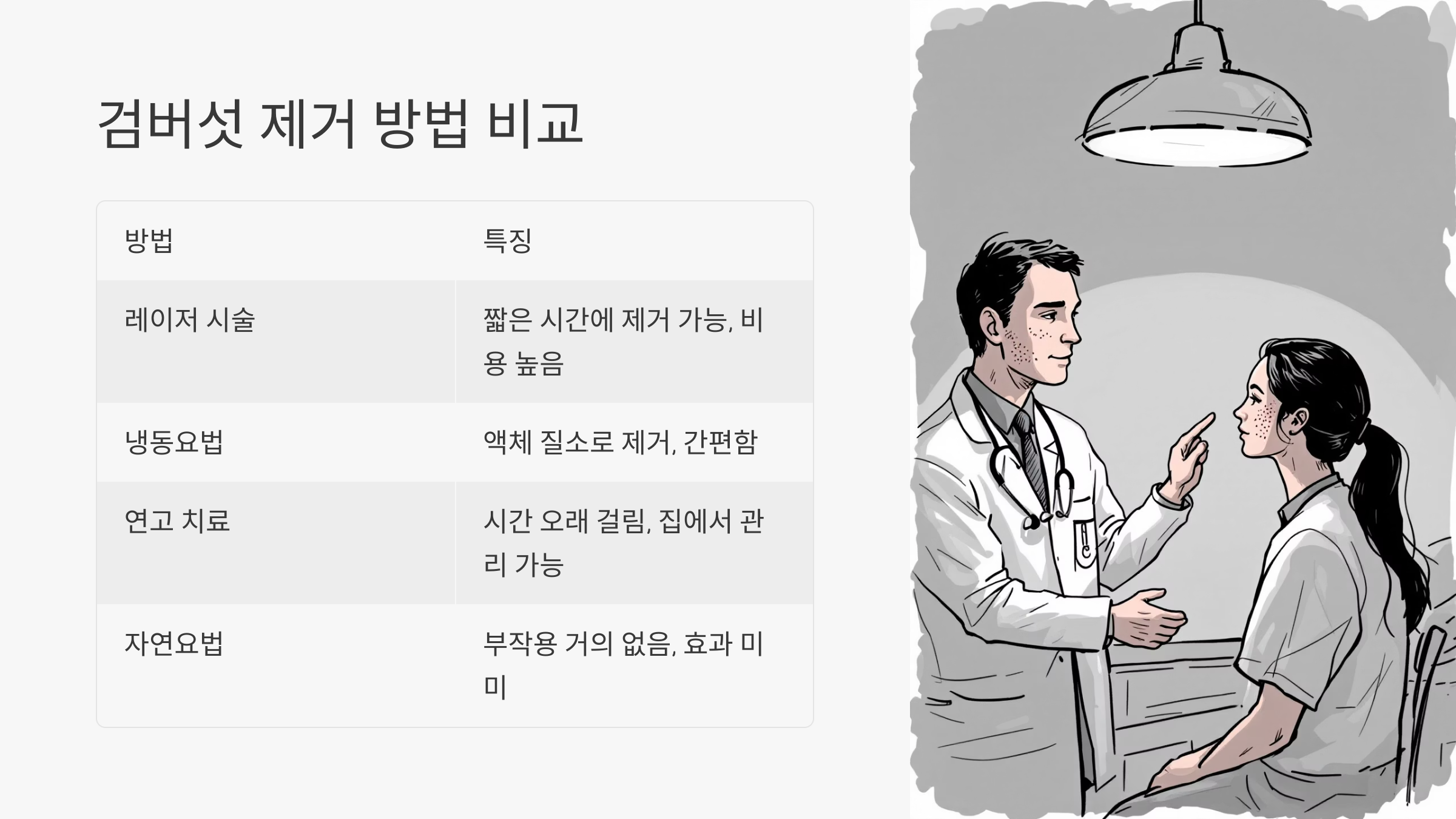 | 레이저 시술 | 짧은 시간에 제거 가능하지만 비용이 높고 붉은기 발생 가능 |