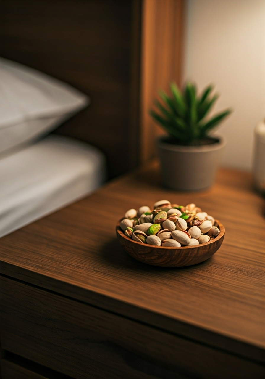 저녁엔 피스타치오와 호두로 숙면과 체중 관리에 도움을 줄 수 있어요.