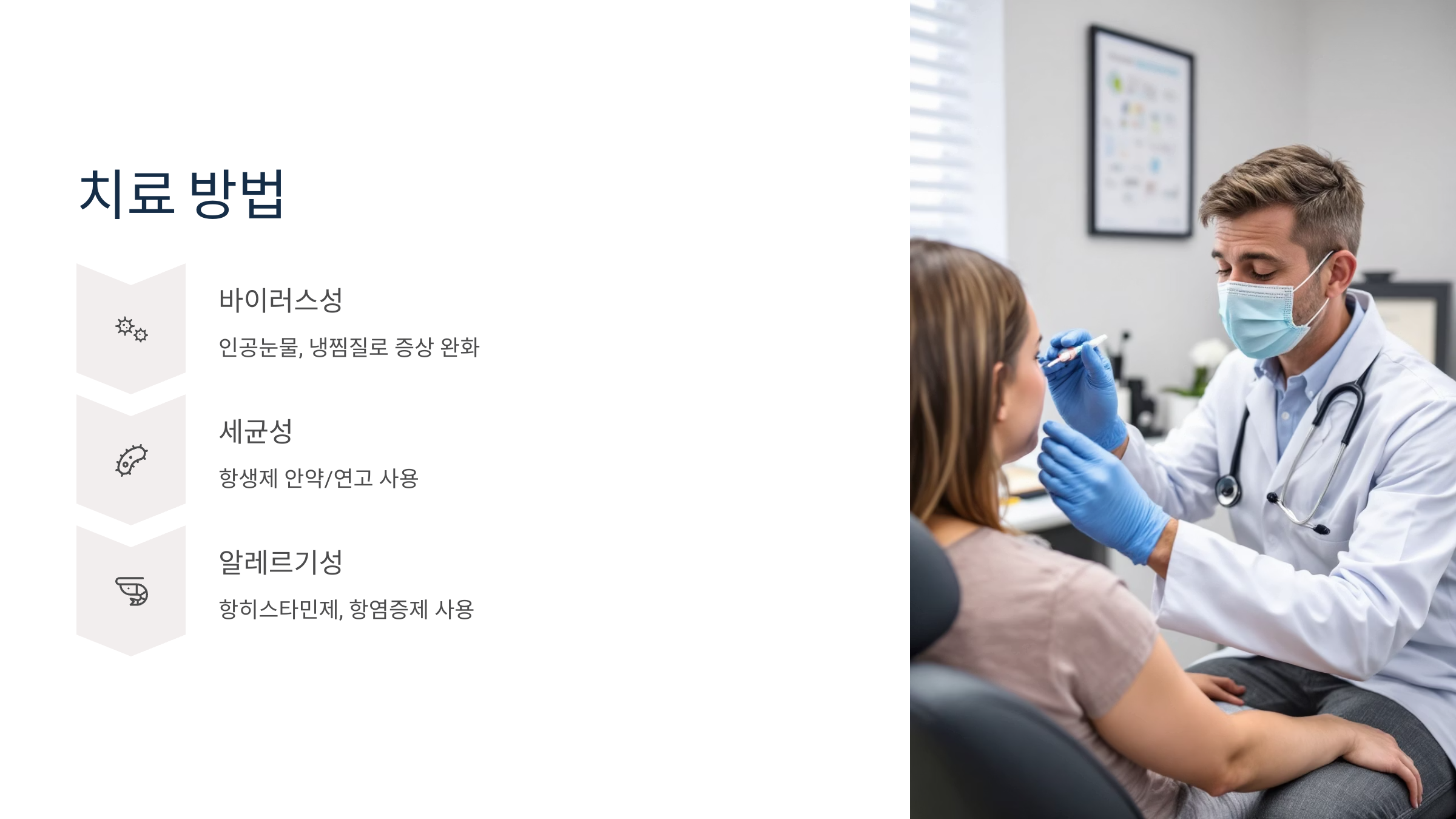 바이러스성, 세균성, 알레르기성 각각 조금씩 다르기 때문에, 정확한 진단이 중요합니다.