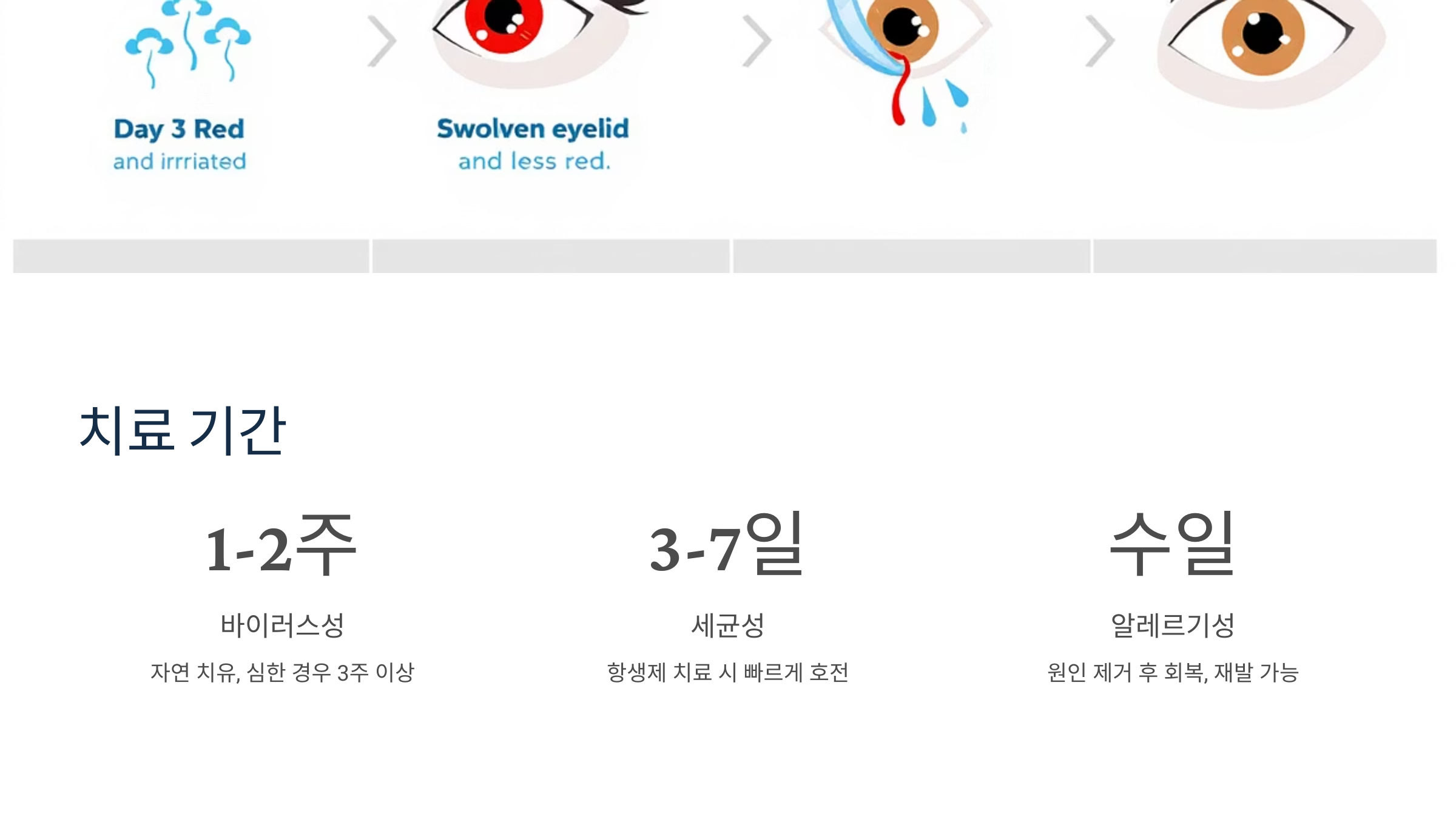| 바이러스성 결막염 | 1주 ~ 2주 | 자연 치유, 심한 경우 3주 이상 지속 |