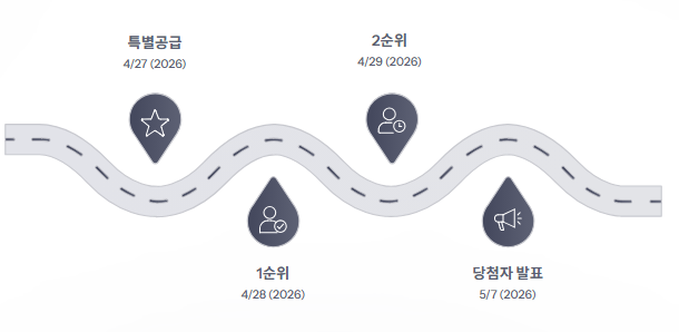 특별공급 접수는 2026년 4월 27일, 1순위 접수는 2026년 4월 28일, 2순위 접수는 2026년 4월 29일입니다. 당첨자 발표는 2026년 5월 7일이며, 서류 접수는 5월 9일부터 5월 13일까지 이어집니다.