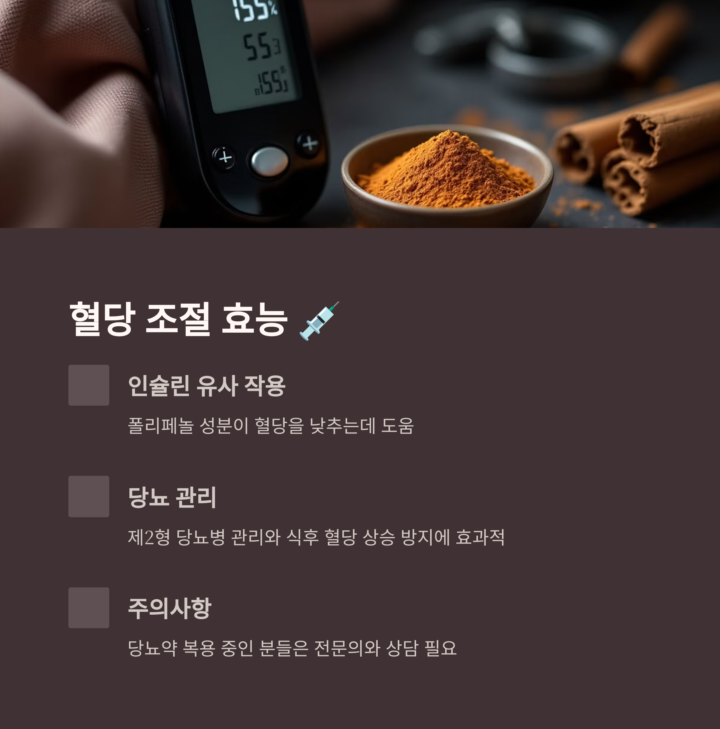 계피의 폴리페놀 성분은 인슐린과 유사한 작용을 한다는 연구 결과가 있어요. 이 말은 곧 계피가 혈당을 낮추는 데 도움을 줄 수 있다는 의미입니다.