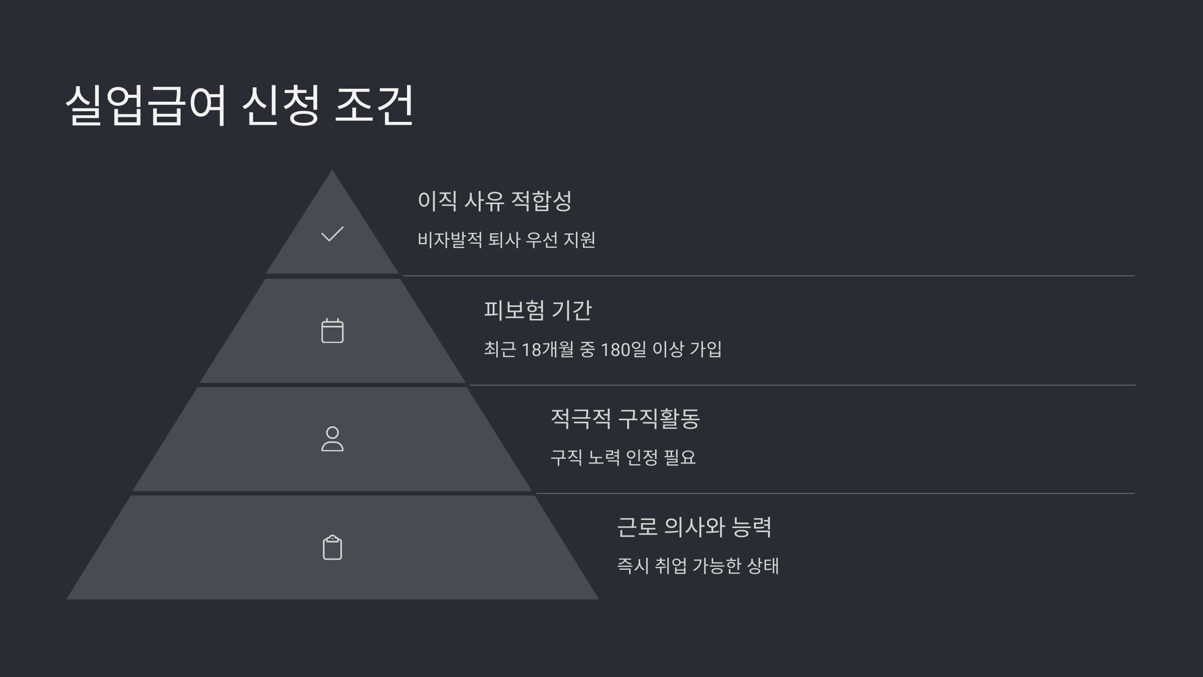 실업급여를 신청하기 위해서는 다음의 조건들을 충족해야 합니다: