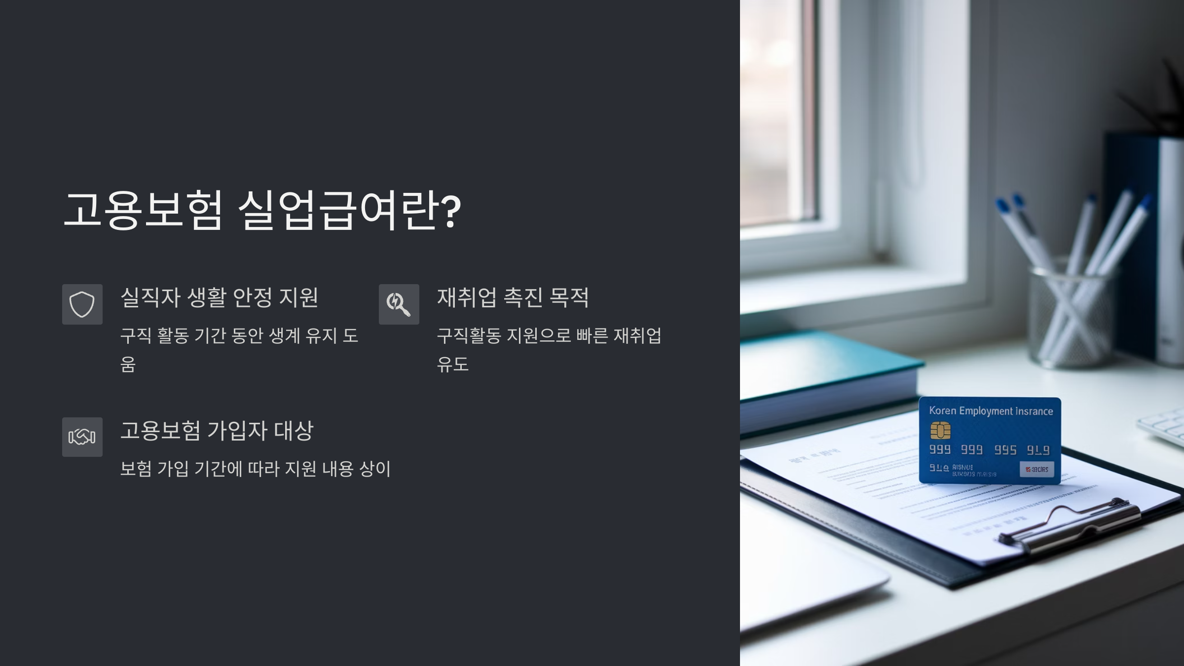 쉽게 말하면, 일을 그만두었을 때 경제적 공백을 메꿔주는 정부의 안전망이라고 볼 수 있어요.