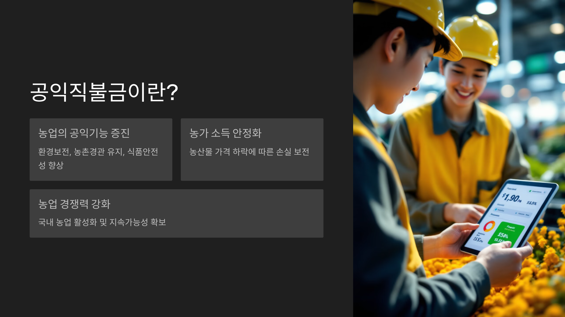 국가가 농업인에게 직접 지급하는 보조금 형태로, 단순한 소득 보전 목적이 아닌 국민 전체에게 이익이 되는 공익적 기능을 수행하도록 유도하는 데 그 목적이 있어요.