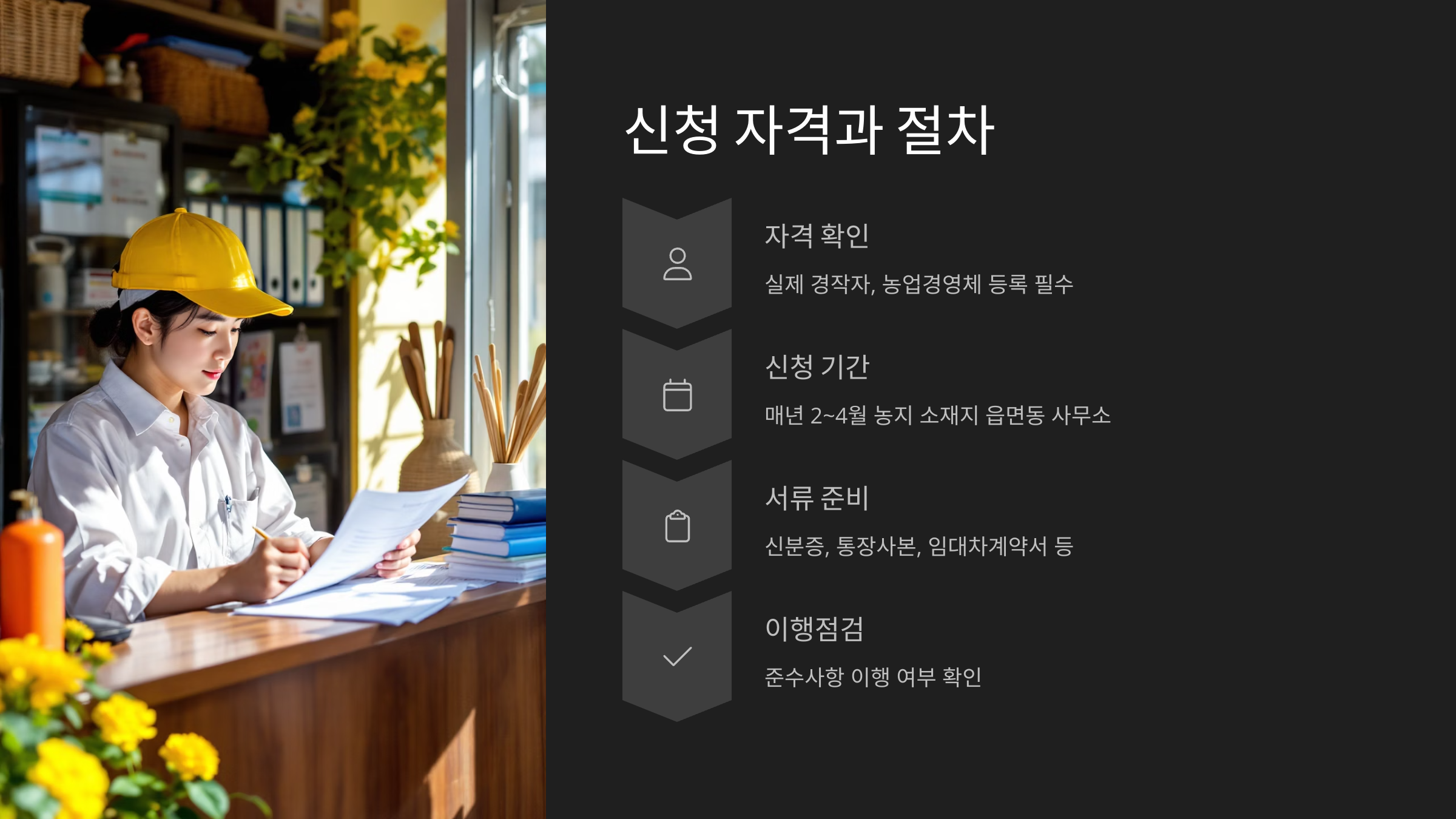 💡 TIP: 농지 소재지 주소지 기준으로 신청해야 해요! 여러 지역에서 경작하는 경우, 주 경작지 기준으로 한 곳만 신청 가능하답니다.