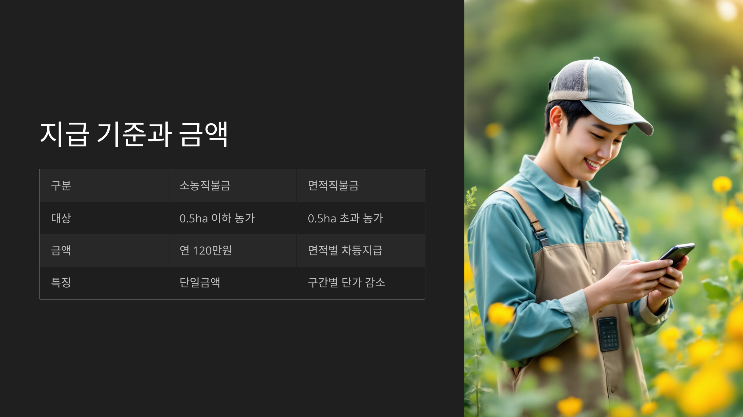 | 소농직불금 | 120만 원 고정 | 0.1~0.5ha 이하, 농업 외 소득 3,700만 원 이하 등 |