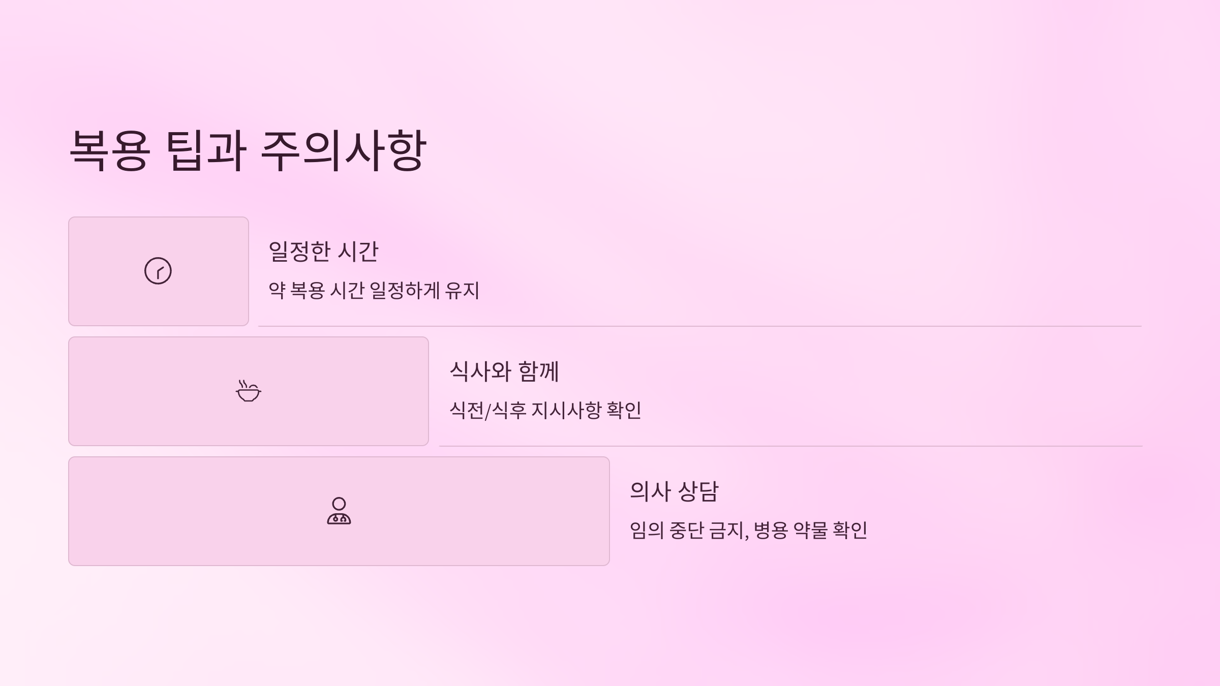 💡 TIP: 약 복용 시간은 항상 일정하게 지키는 것이 중요해요. 음식과 함께 복용하는지, 식전에 먹는 약인지도 꼭 확인하세요.
