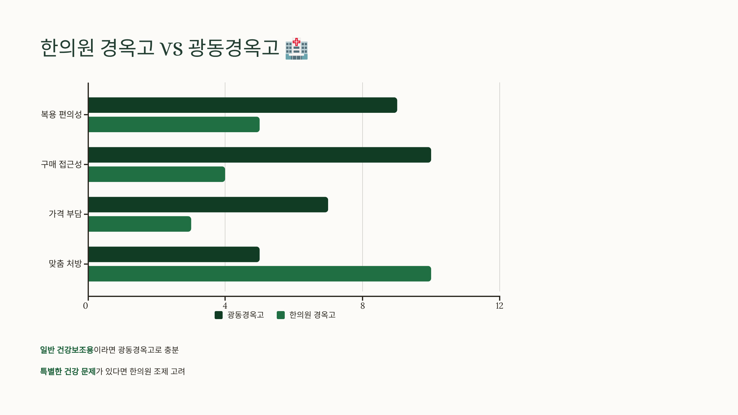 일반 건강보조용이라면 광동경옥고로도 충분하지만, 특별한 건강 문제가 있다면 한의원에서 조제 받는 것도 고려해볼 수 있어요.