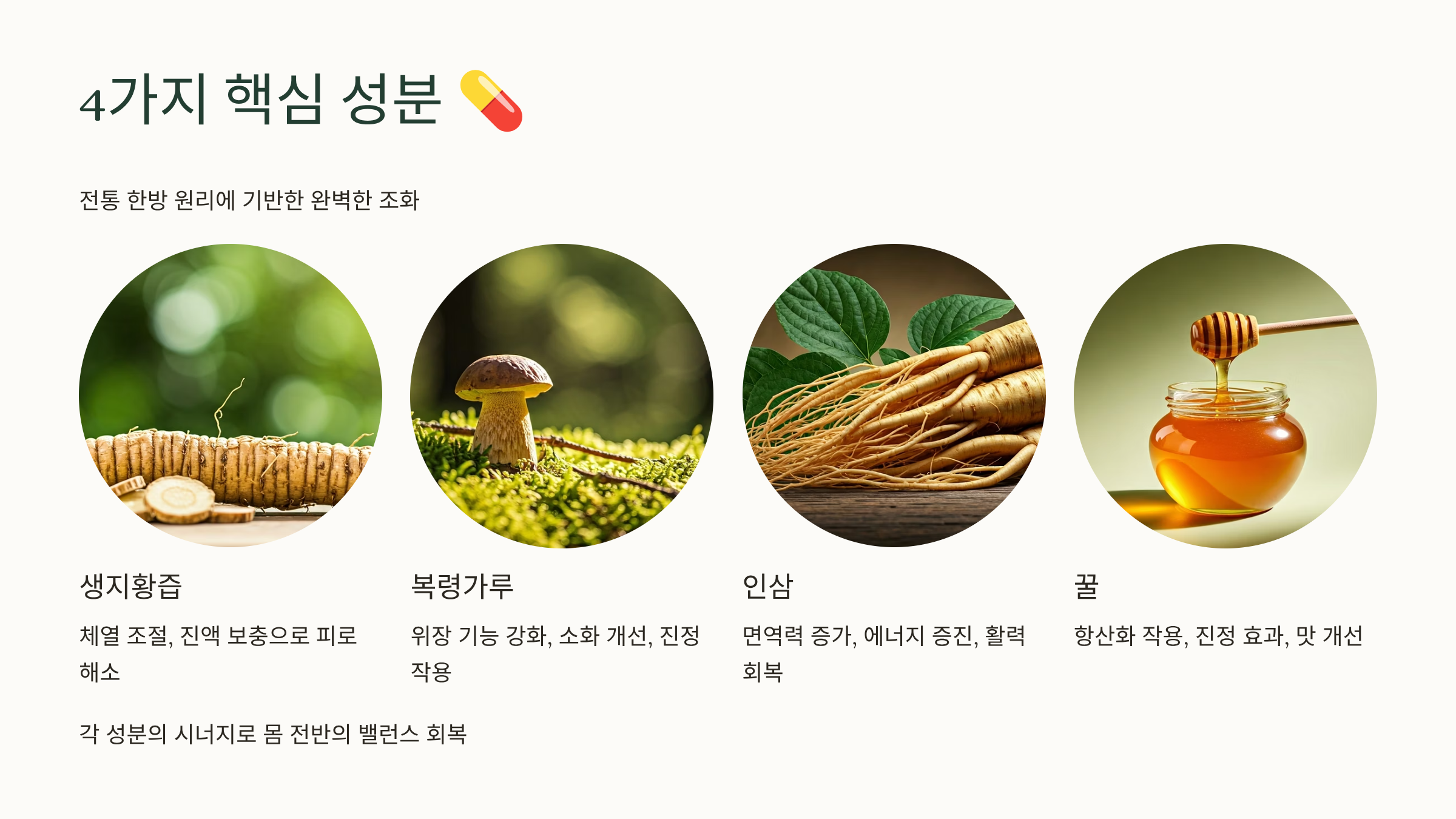 각 성분은 서로 시너지를 내며 몸 전체의 균형을 잡아주고, 기력을 회복시키는 데 도움을 줍니다.