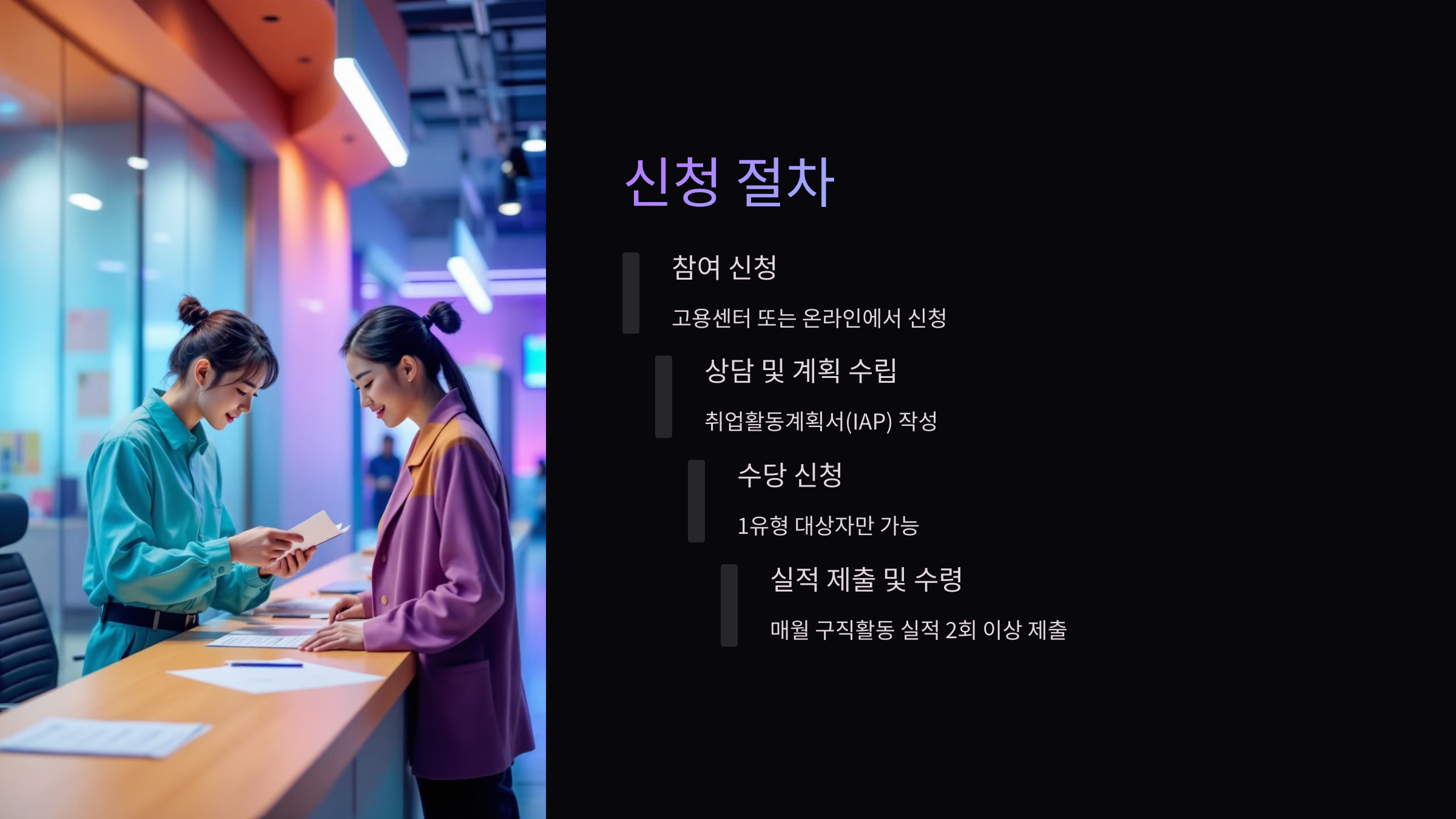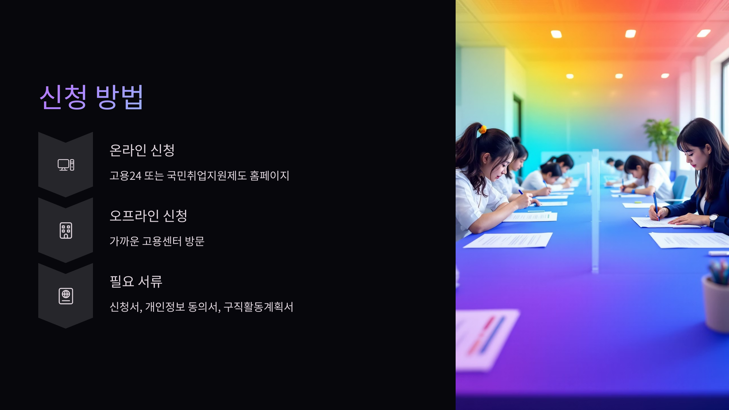 - 오프라인 신청: 가까운 고용센터에 방문하여 신청서, 개인정보 제공 동의서, 구직활동계획서를 제출합니다.