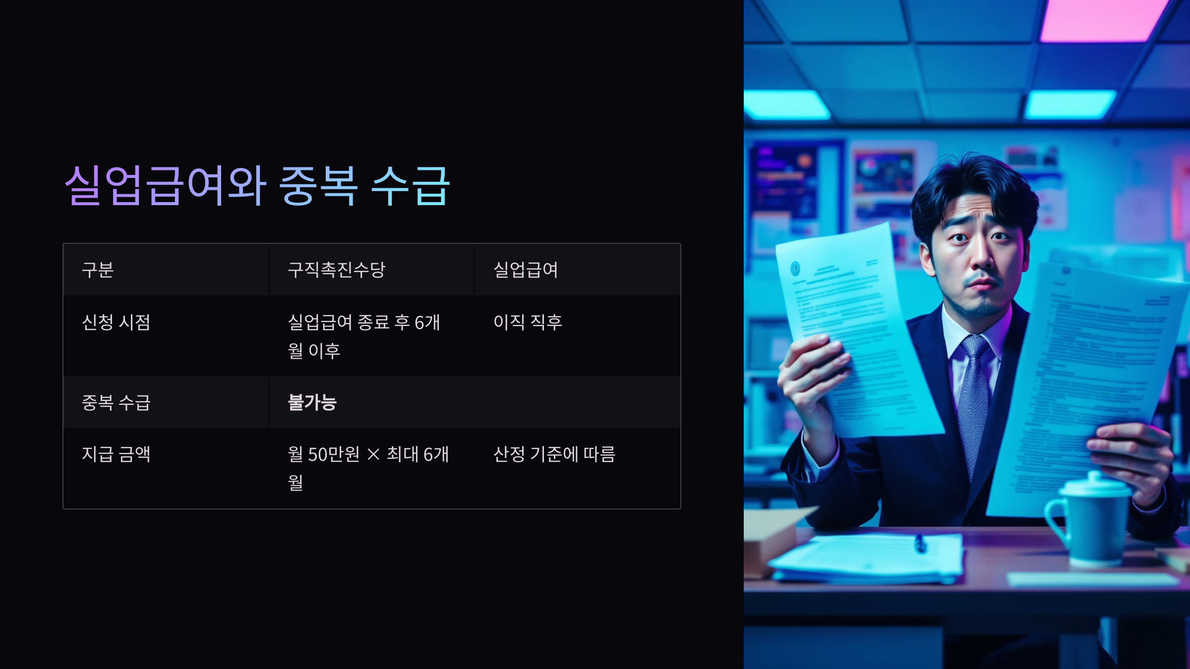많이들 헷갈리는 부분이에요. 실업급여와 구직촉진수당은 중복 수급이 불가능합니다.