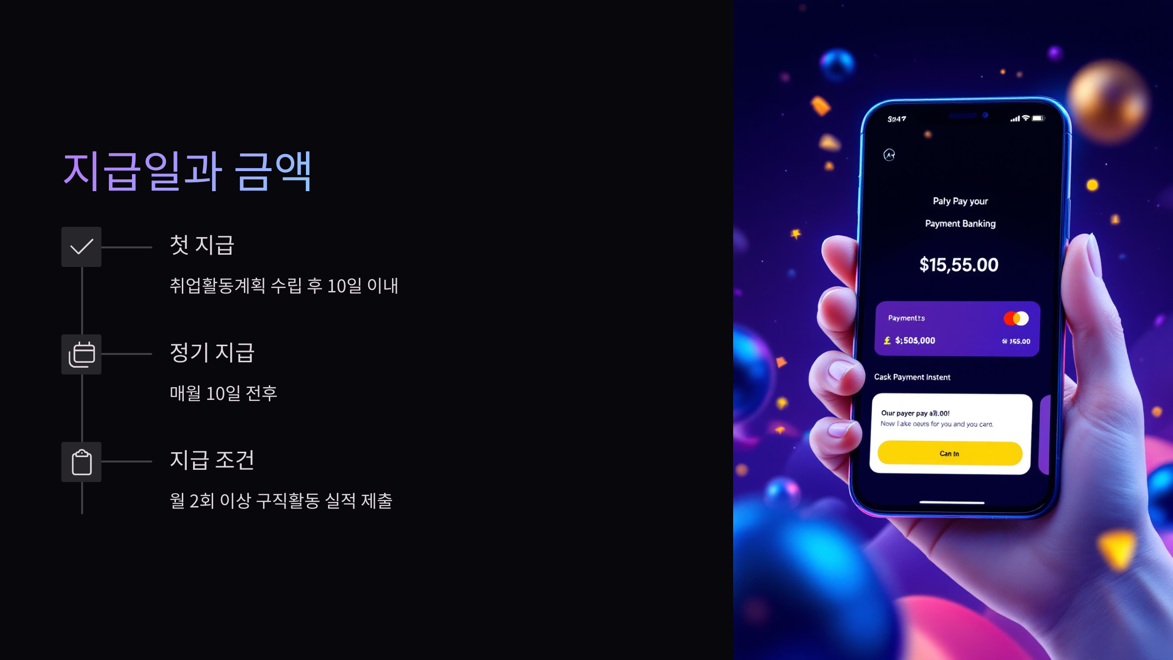 - 첫 지급일: 상담 및 취업활동계획 수립 완료 후 10일 이내