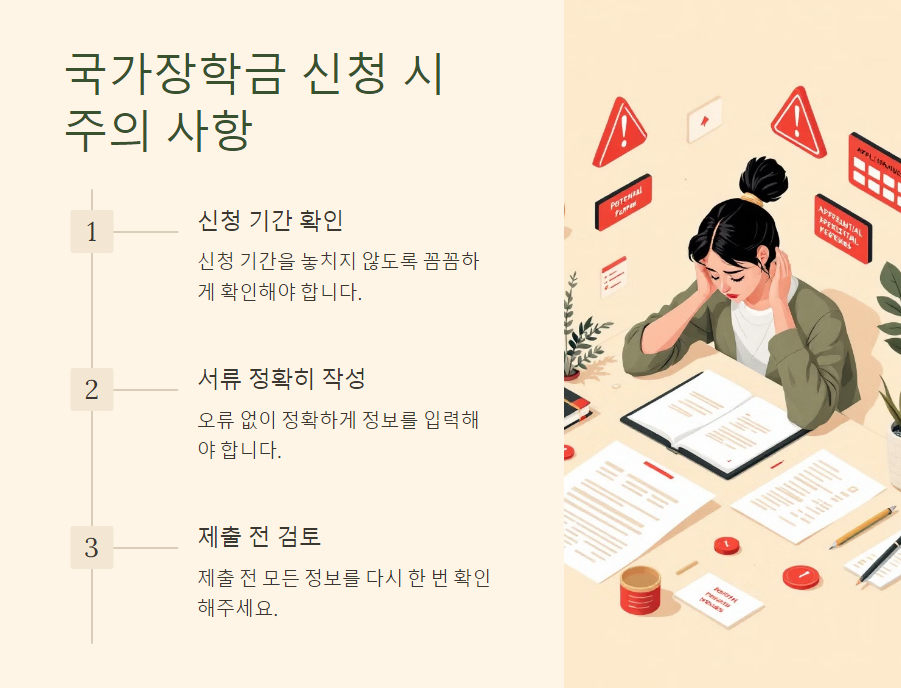 ✅ 신청 마감일을 놓치지 마세요! 국가장학금 신청은 1차와 2차로 나뉘어 진행되며, 신청 기간을 놓치면 다음 학기까지 기다려야 합니다.