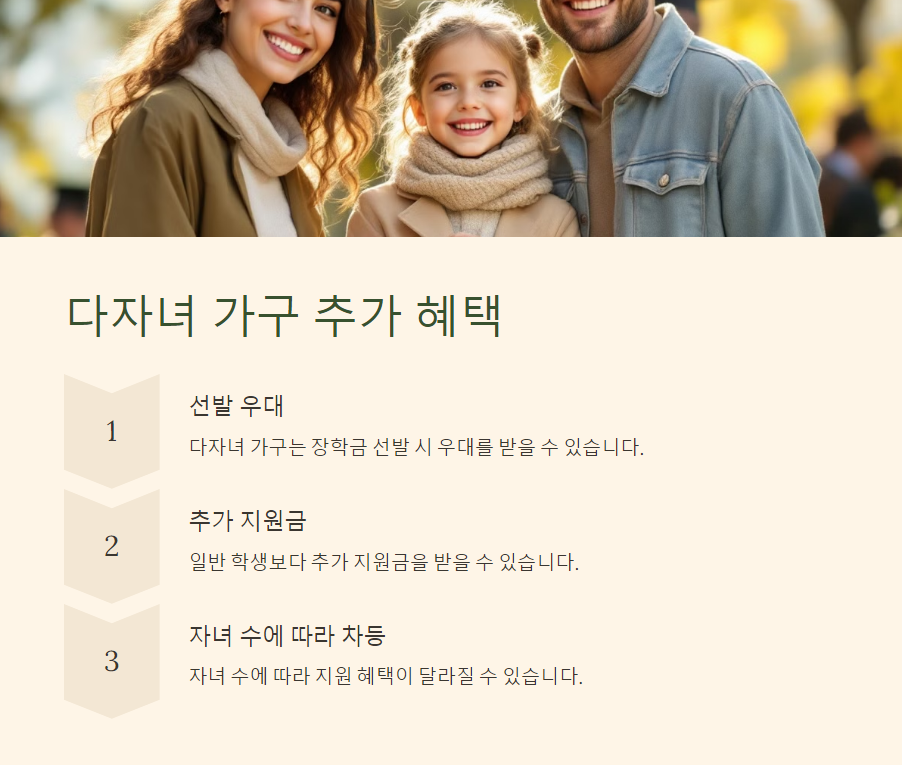 다자녀 가구 장학금은 소득 구간과 무관하게 지급되므로, 해당되는 가구는 꼭 신청하세요!