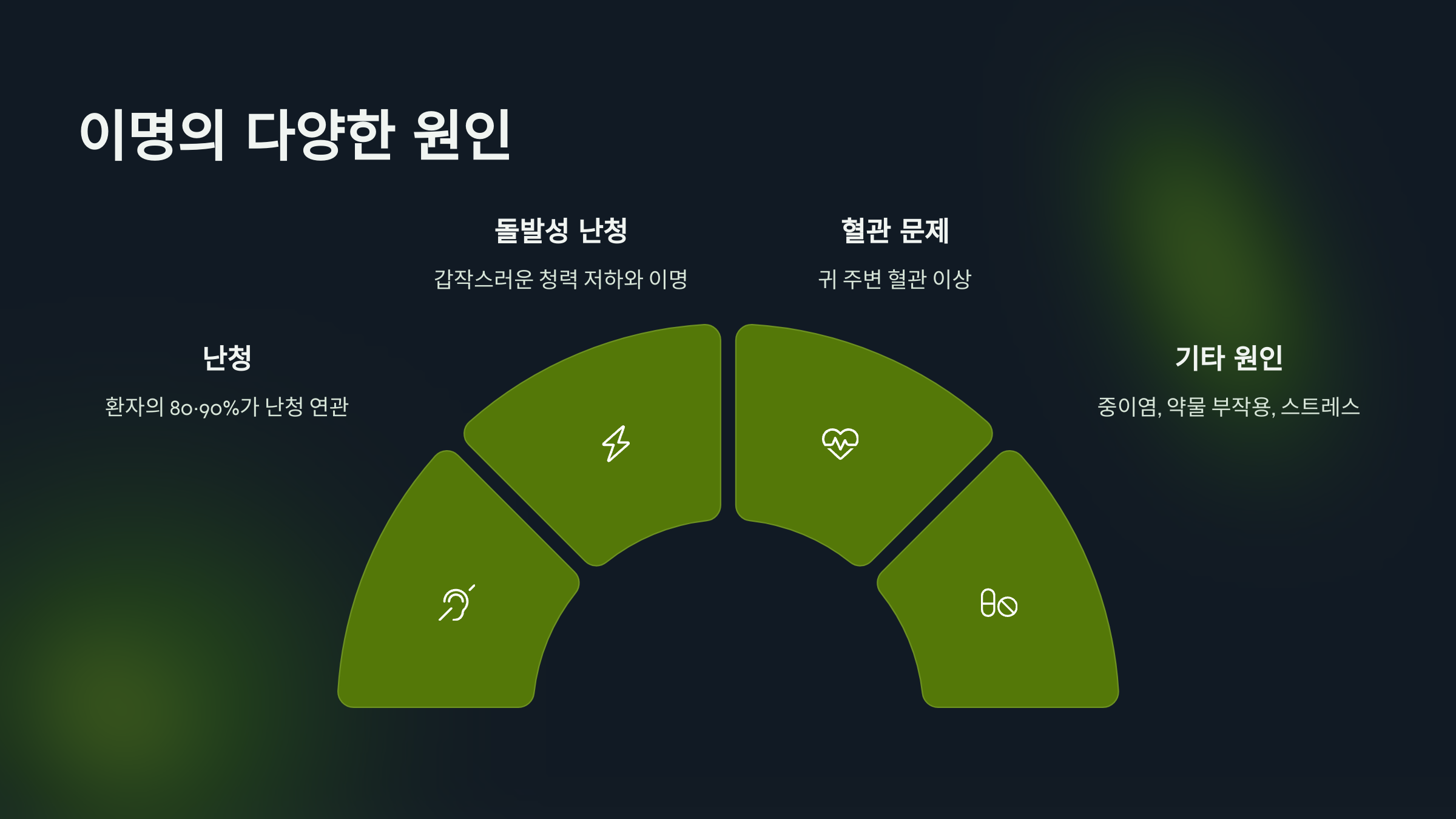 - 난청(청력 저하) - 전체 이명 환자의 80~90%는 난청과 연관되어 있어요. 노인성 난청, 소음성 난청, 돌발성 난청 등이 주요 원인입니다.