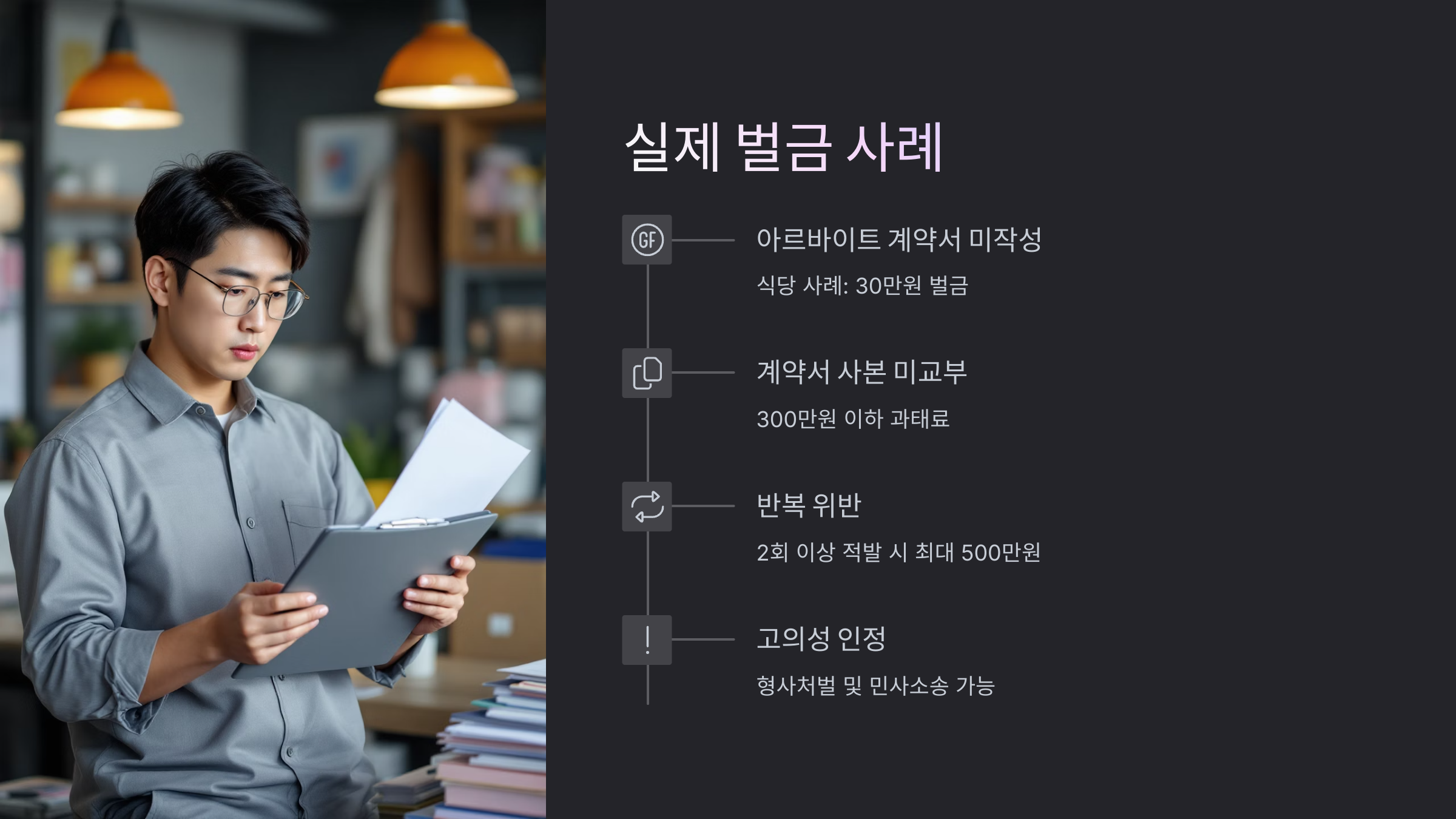 ✔️ 사례 3: 반복적으로 계약서 미작성 → 누적 2회 이상 적발 시 최대 500만 원 벌금