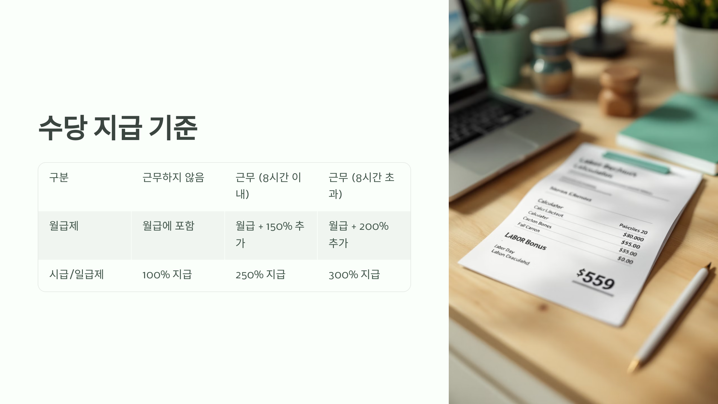 | 월급제 | 월급에 포함 | 월급 + 150% 추가 | 월급 + 200% 추가 |