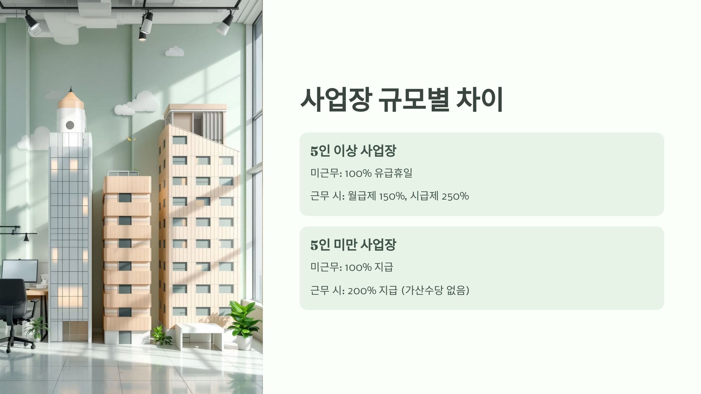 🔖 체크포인트 2: 5인 미만은 유급휴일 보장만 있고 가산수당은 선택이에요.