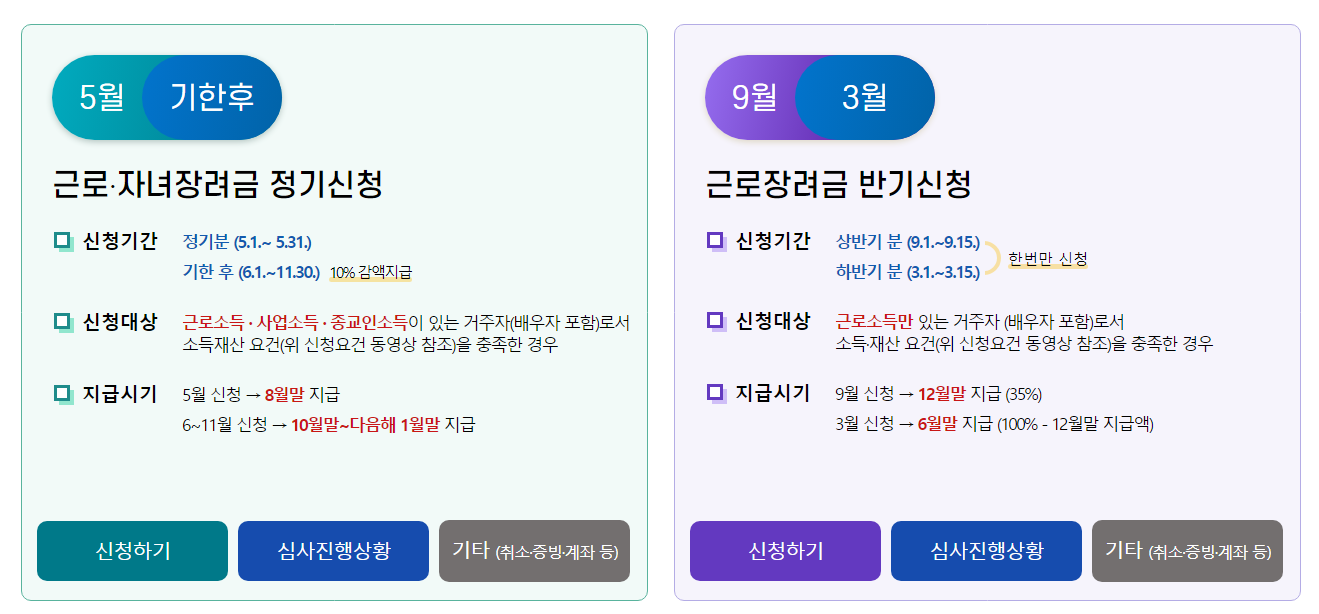 근로/자녀장려금 정기 신청 기한은 5월1일 부터 5월 31일 까지 였으며, 이 기간내에 신청한 경우 가장 유리한 조건으로 지급 받을 수 있습니다.