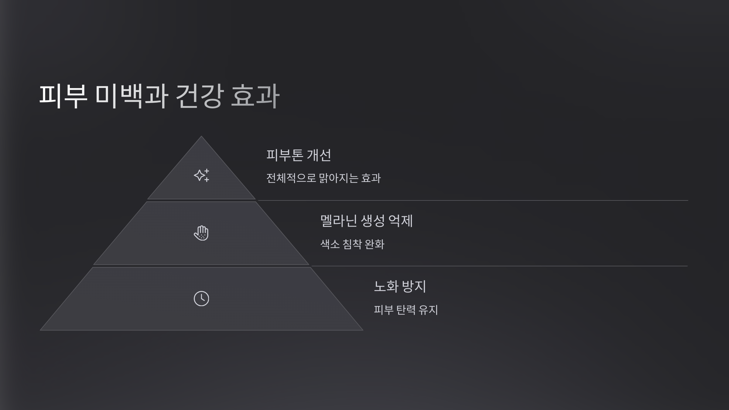 멜라닌 생성을 억제하거나 조절하는 기능으로 인해, 피부톤이 전체적으로 맑아지고 색소 침착이 완화될 수 있어요. 특히 기미, 잡티, 칙칙한 피부톤 개선에 효과적이라는 연구 결과도 있어요.