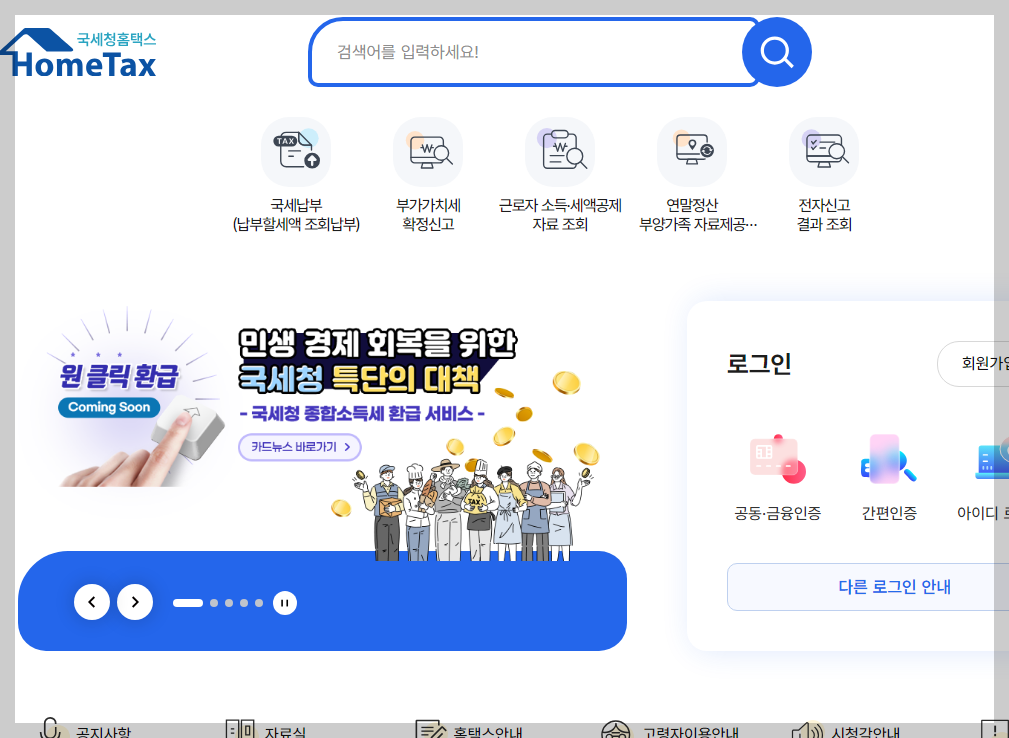 - 국세청 홈택스(www.hometax.go.kr)에 접속합니다.