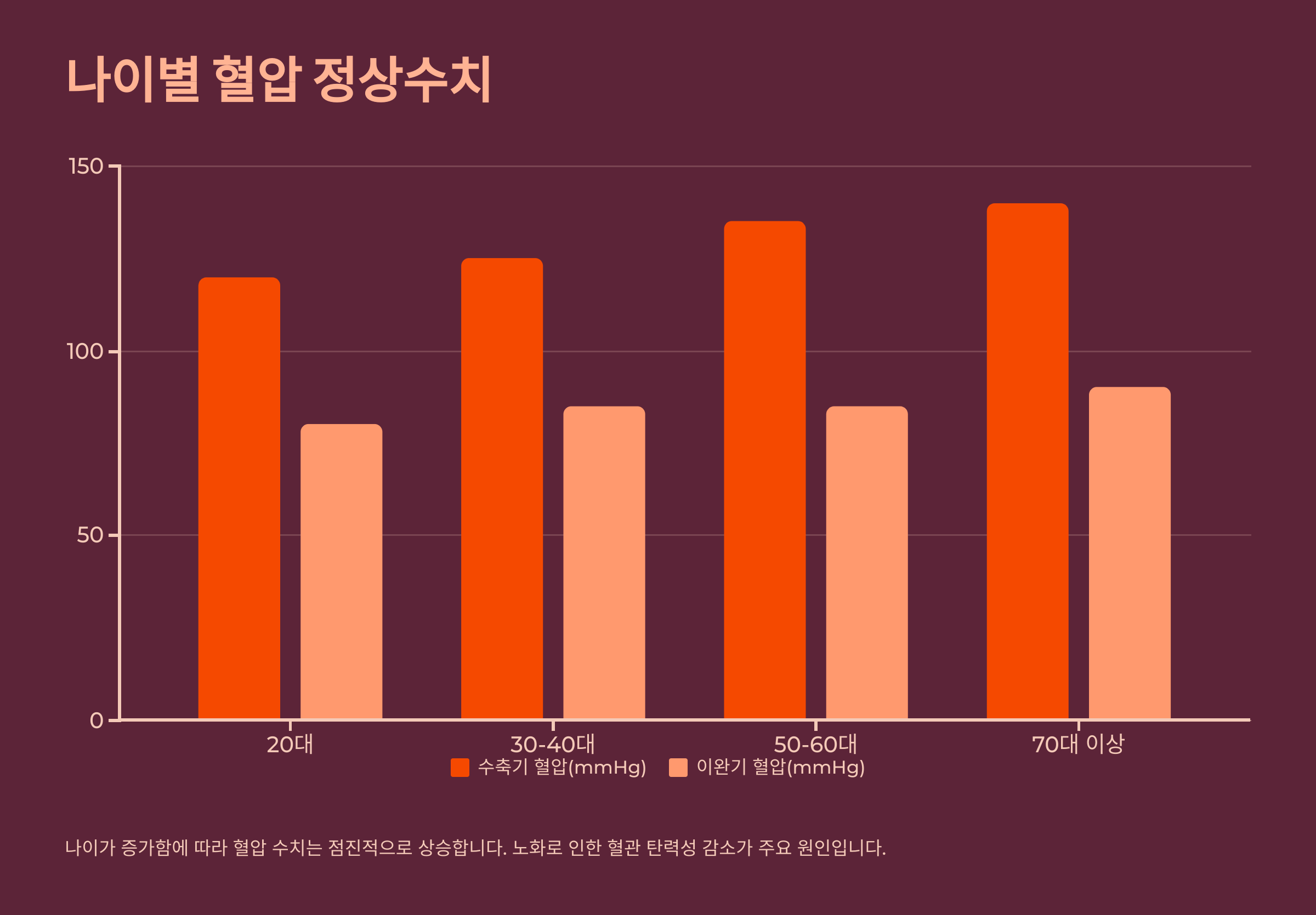 나이가 들수록 혈관 탄력이 떨어지기 때문에 평균 혈압이 높아지는 경향이 있지만, 고혈압 기준은 나이와 무관하게 동일하게 적용됩니다.