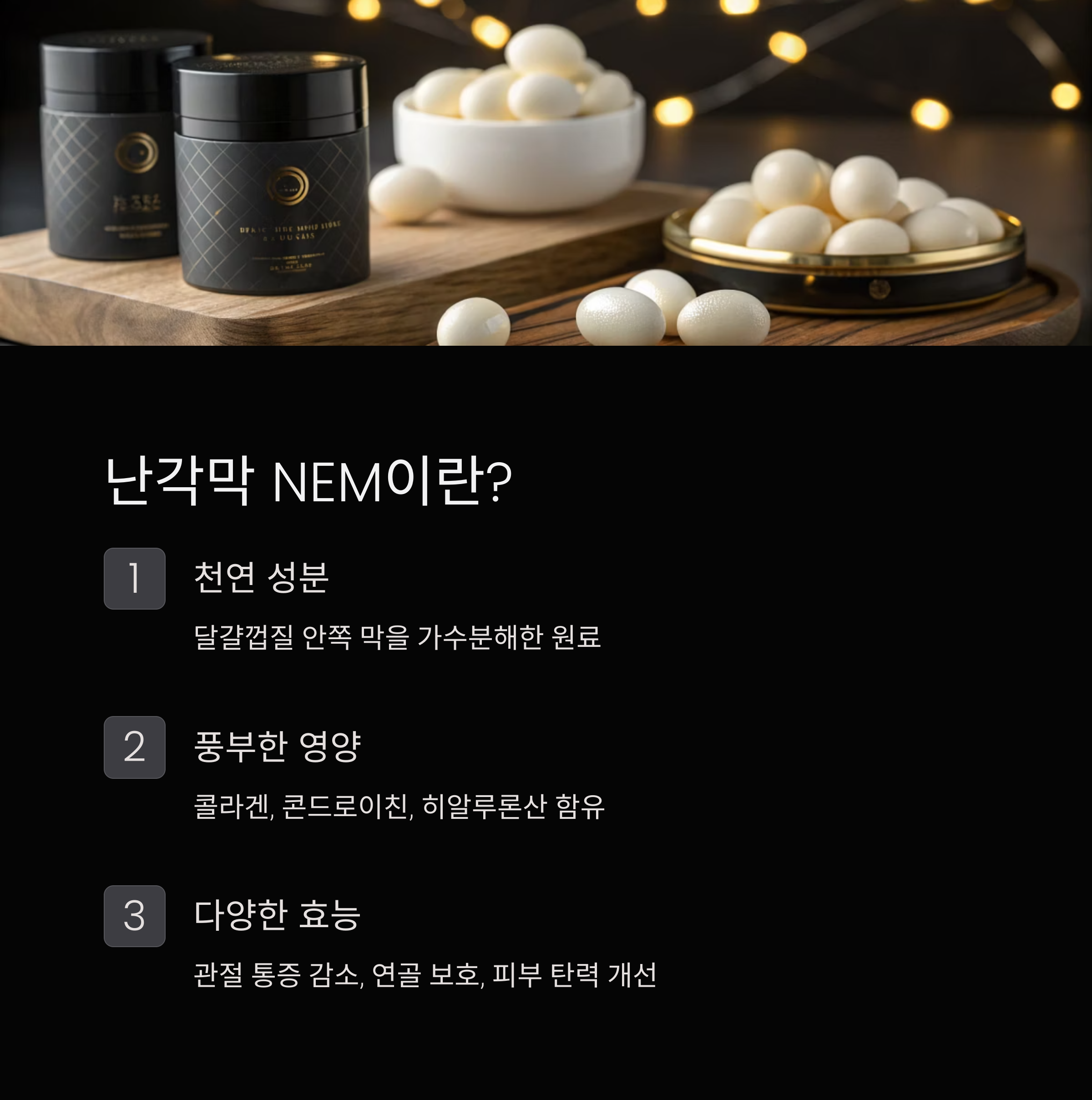 난각막 NEM은 달걀껍질 안쪽에 있는 얇은 막을 가수분해한 건강기능식품 원료입니다.