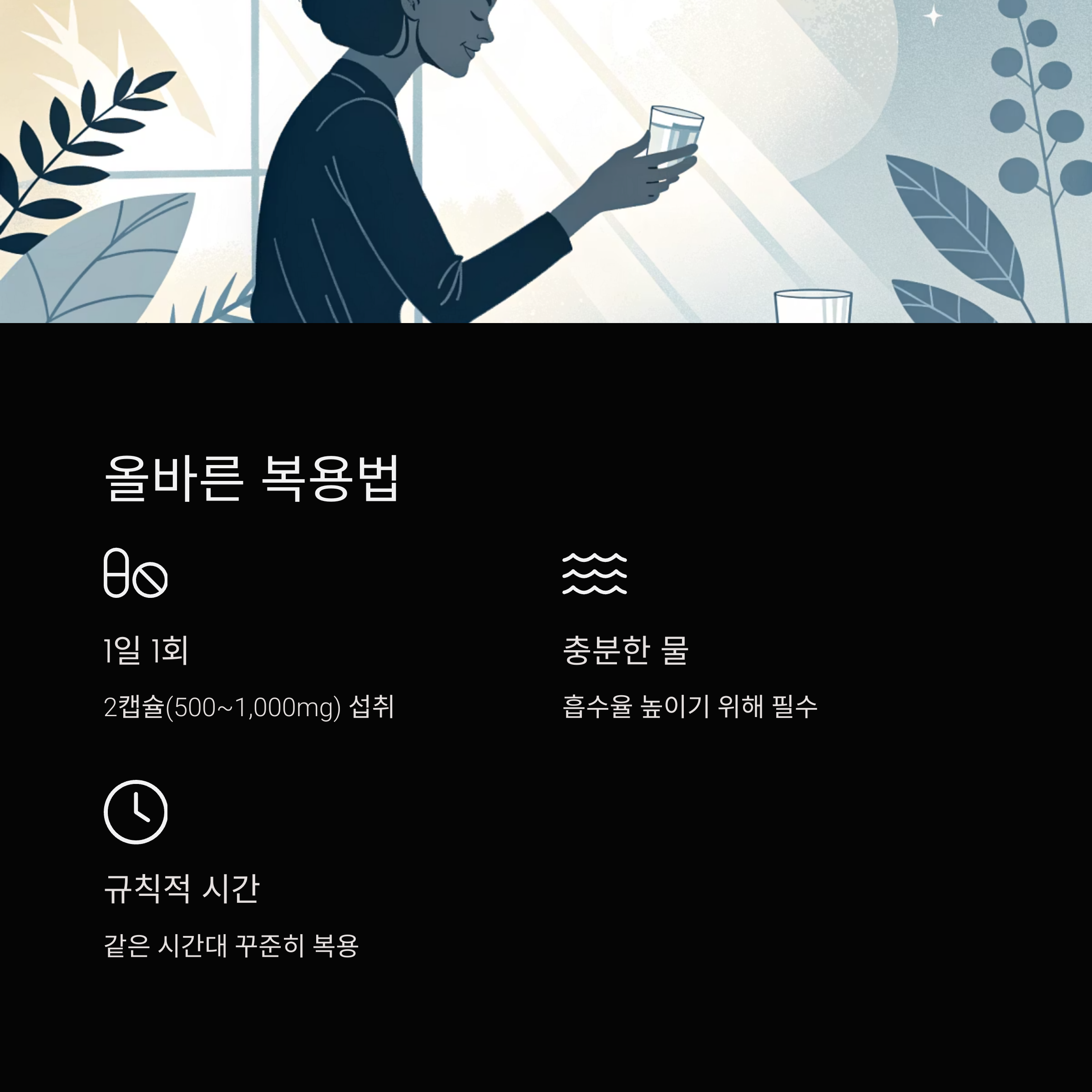 💡 TIP: 반드시 충분한 물과 함께 복용하고, 꾸준히 같은 시간대에 섭취하는 것이 좋아요.
