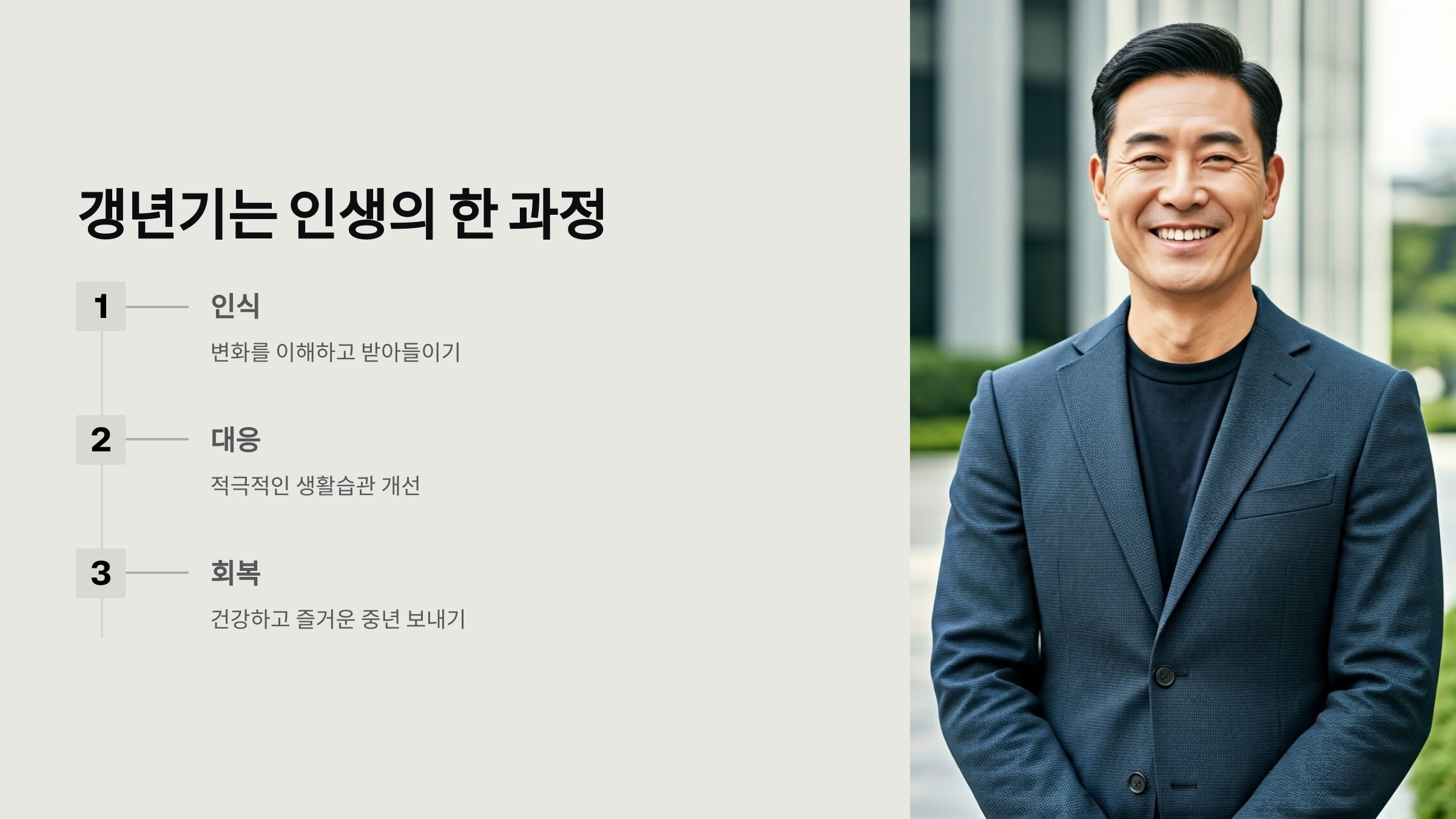 갱년기는 인생의 한 과정일 뿐이에요. 올바르게 대응하면 더 건강하고 즐거운 중년을 보낼 수 있답니다.