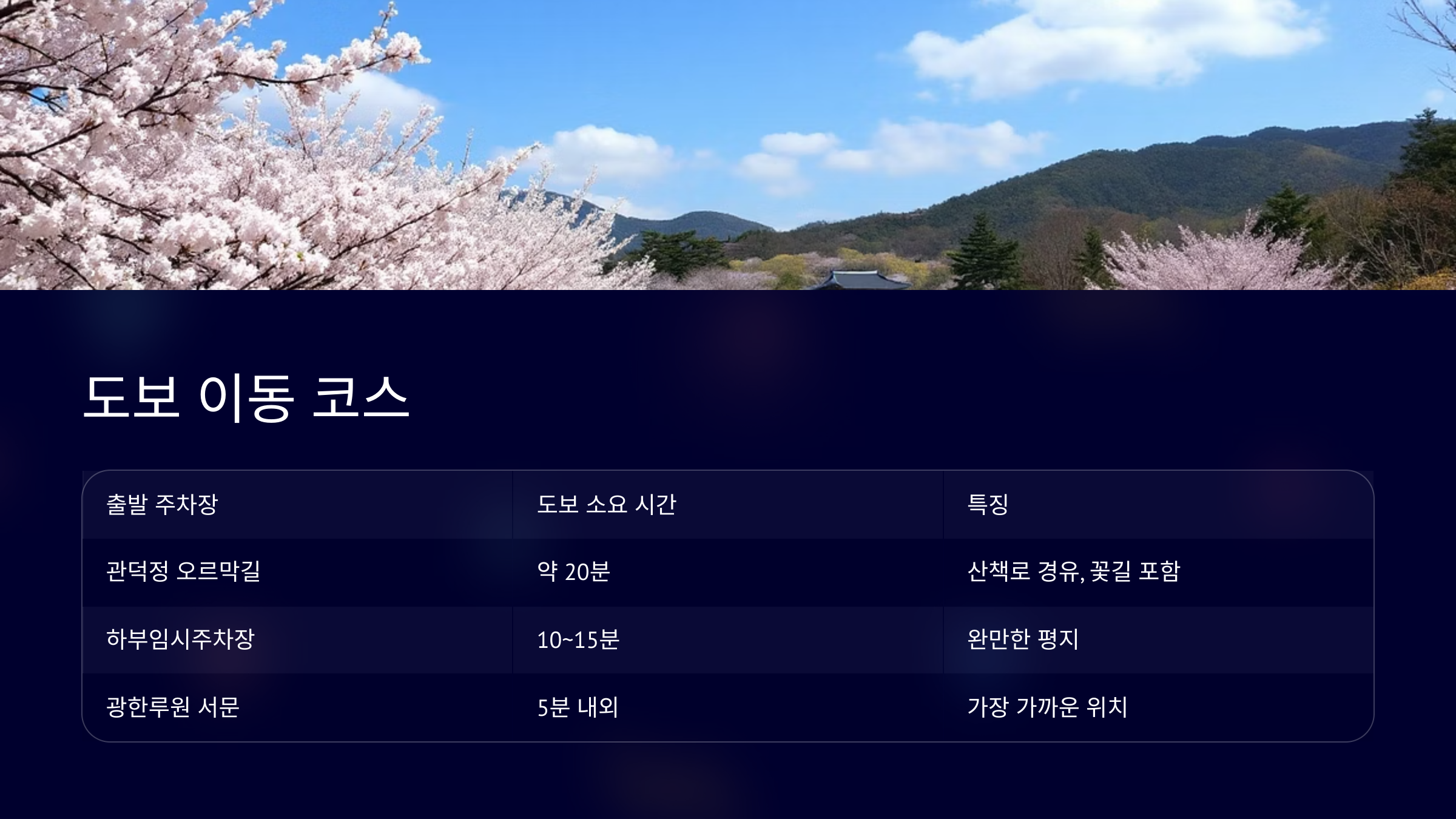 | 출발 주차장 | 도보 소요 시간 | 특징 |