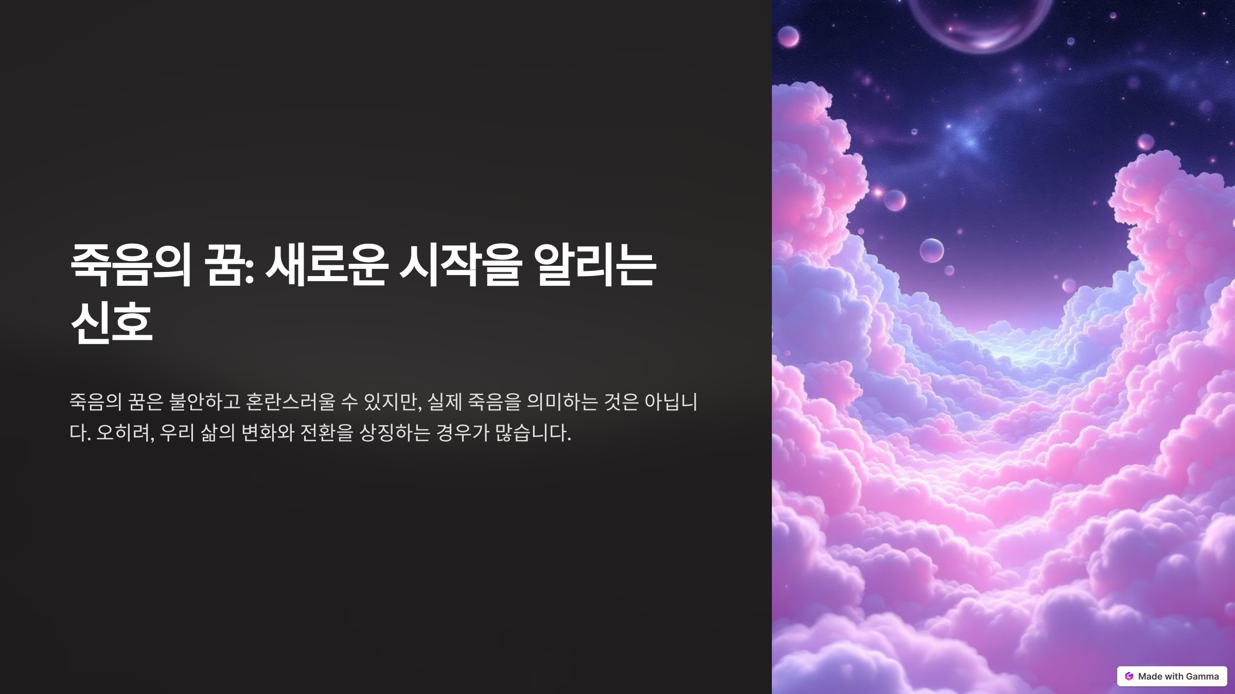 내가 죽는 꿈은 단순히 두려움을 불러일으키는 꿈이 아니라, 새로운 시작과 변화를 암시하는 중요한 메시지입니다. 이를 통해 자신의 내면을 들여다보고, 현실에서의 문제를 해결하며, 더 나은 미래를 준비할 수 있습니다. 꿈은 우리의 무의식이 보내는 선물이므로, 그 의미를 깊이 이해하고 실천으로 옮기는 것이 중요합니다.