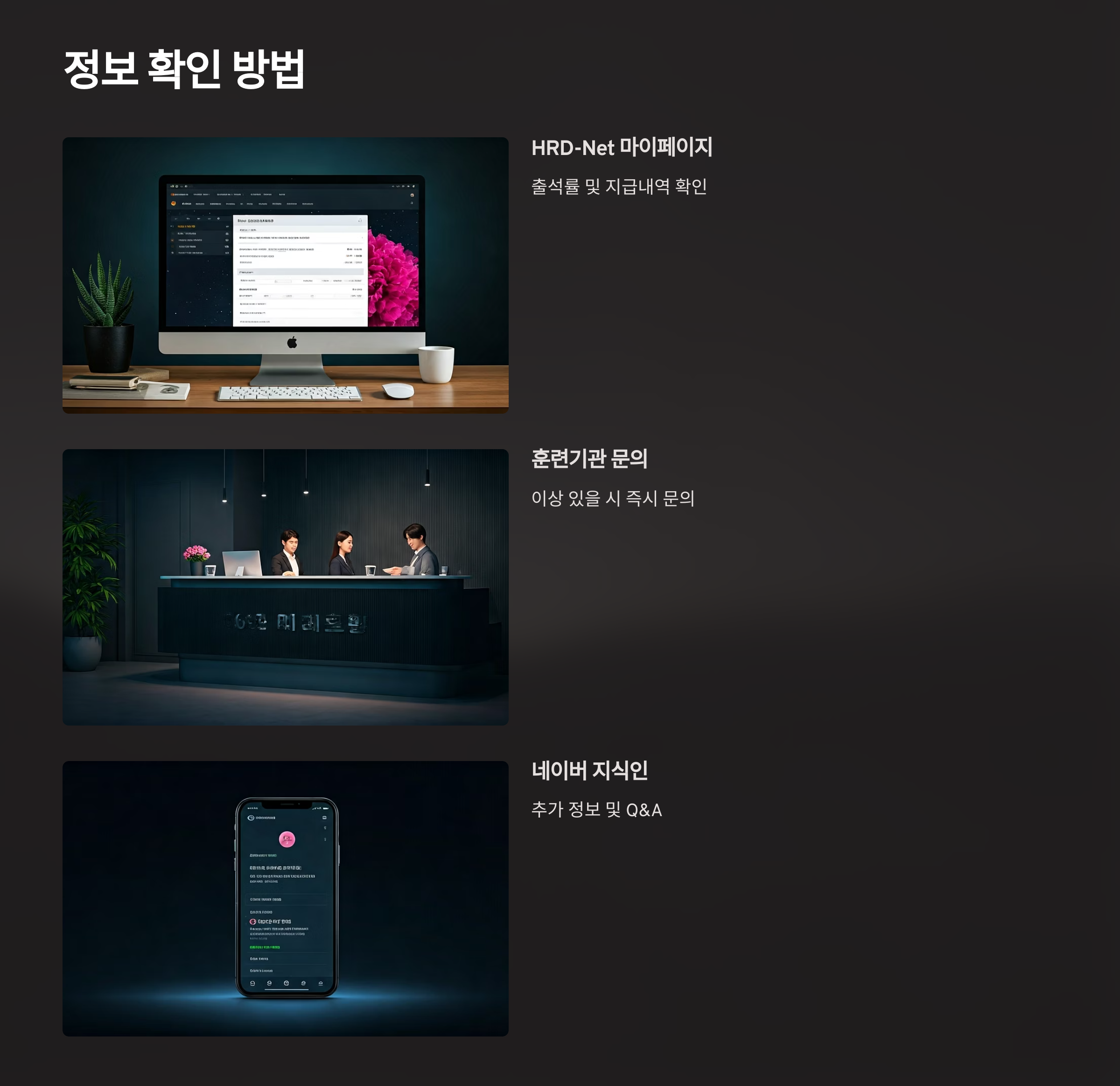 지급 내역과 출석률은 HRD-Net 마이페이지에서 확인 가능하며, 이상이 있으면 훈련기관에 바로 문의하시는 게 좋아요.