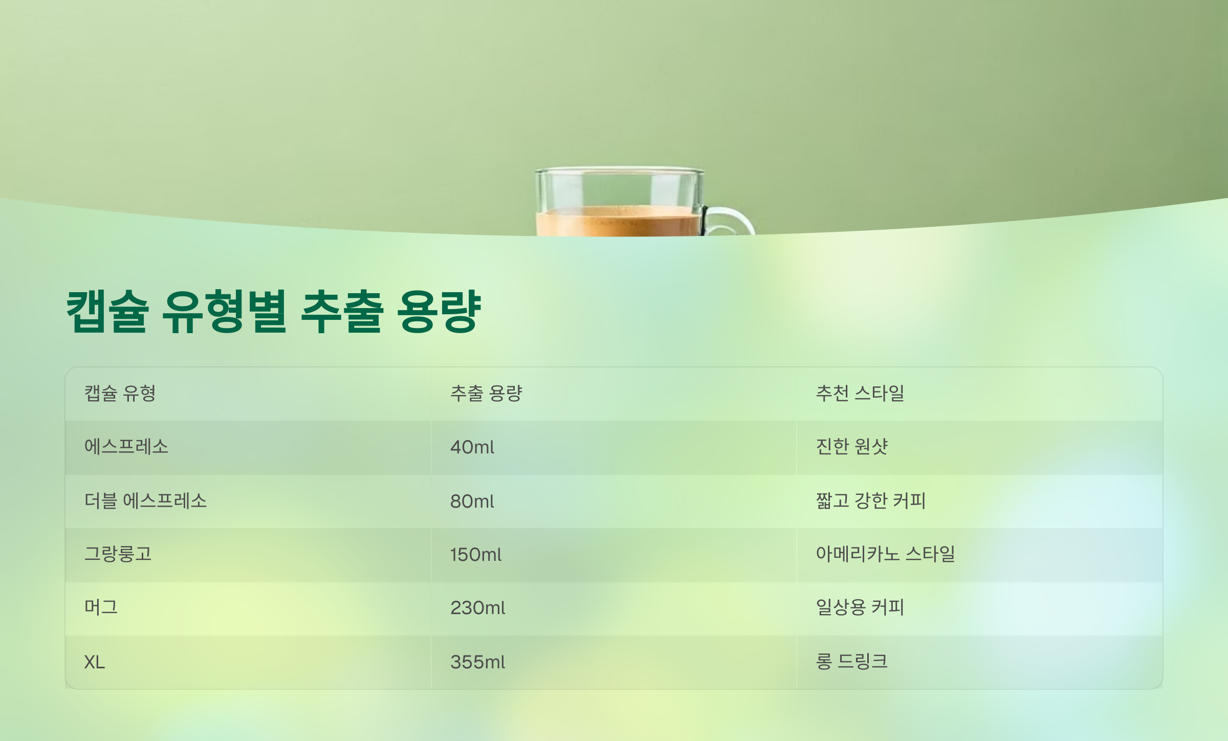 | 캡슐 유형 | 추출 용량 | 추천 스타일 |